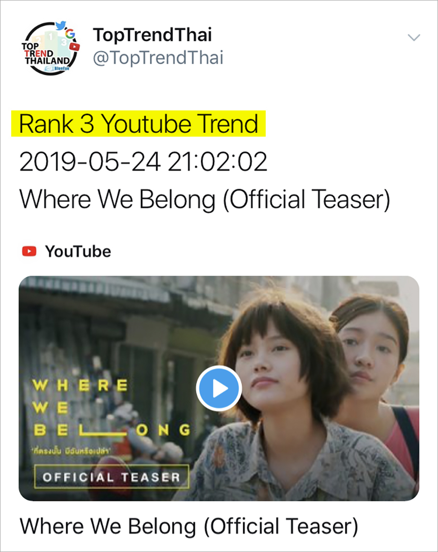 สำหรับภาพยนตร์ Where We Belong พร้อมเข้าฉายในโรงภาพยนตร์ 20 มิถุนายนนี้