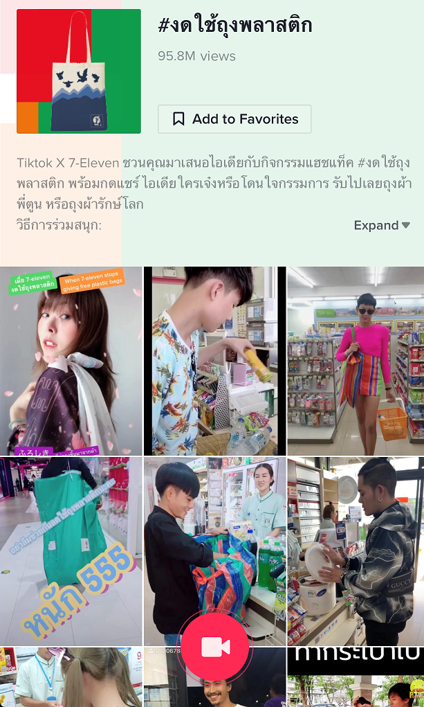 และล่าสุดที่เกิดกระแสพูดถึงกันสำหรับ แคมเปญ #งดใช้ถุงพลาสติก ที่เป็นความร่วมมือระหว่าง TikTok และ เซเว่น-อีเลฟเว่น ในการทำแคมเปญรักษ์โลก ชวนเหล่าครีเอเตอร์ร่วมใส่ใจสิ่งแวดล้อม ลด ละ เลิก ใช้ถุงพลาสติก พร้อมเสนอไอเดียเก๋ๆ ในการนำภาชนะอื่นๆ ที่ไม่ใช่ถุงพลาสติกนำไปใส่สินค้าที่ซื้อจากร้านเซเว่น-อีเลฟเว่นแทน เพื่อชิงของรางวัลเป็นถุงผ้าพี่ตูน หรือถุงผ้ารักษ์โลก จากไอเดียสุดเจ๋งบวกกับความสนุกสนานของคนไทย เพียงชั่วข้ามคืนก็ทำให้แคมเปญนี้เกิดเป็นกระแสและมียอดวิวพุ่งสูงกว่า 95.2 ล้านวิว