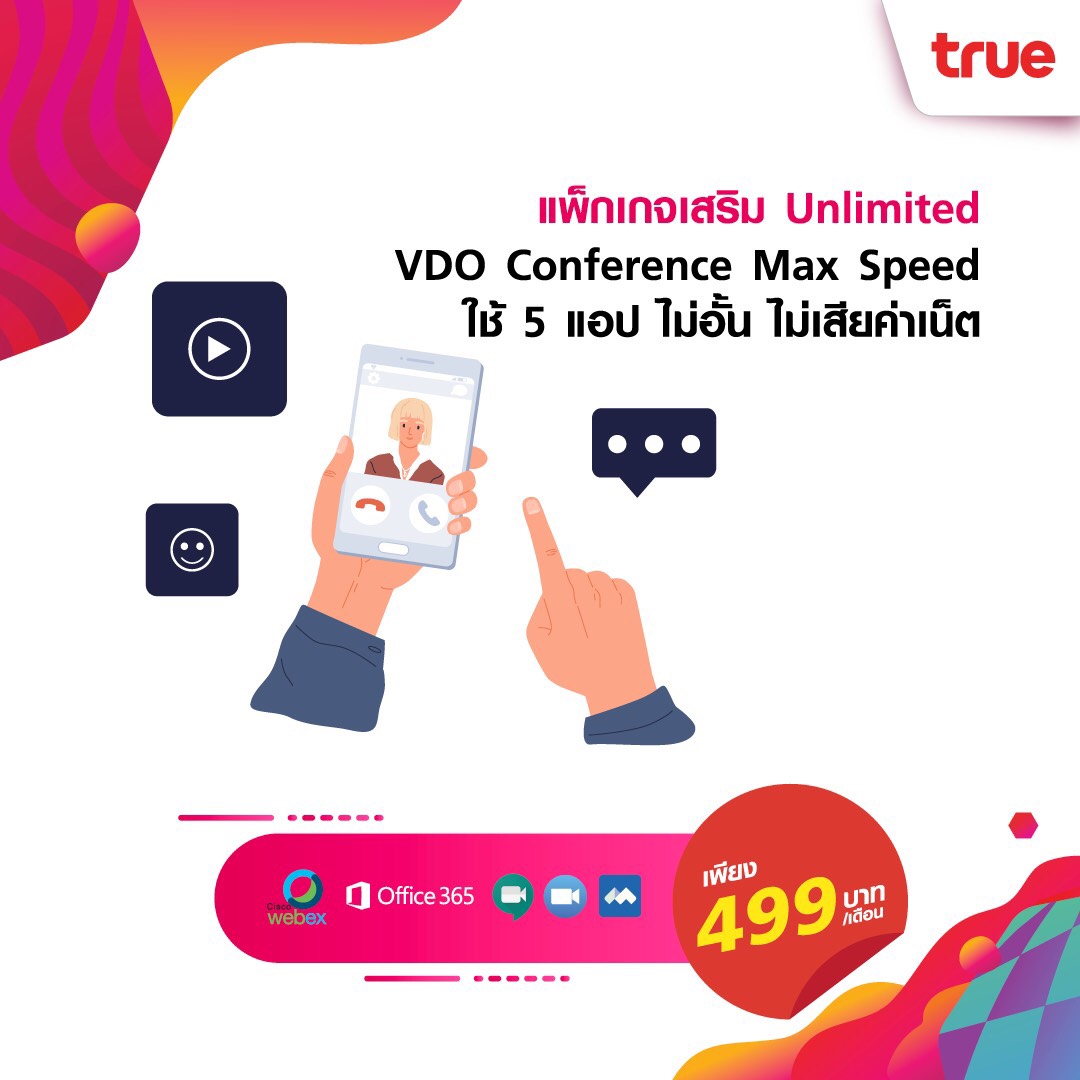 - แพ็กเกจเสริม Unlimited VDO Conference Max Speed 5 แอป ได้ทั้ง Cisco WebEx, Microsoft Office 365, Google Hangouts Meet, VOOV Meeting และ Zoom ฟรีไม่อั้นไม่เสียค่าเน็ต พร้อมเน็ตความเร็วสูงสุด 50 GB/เดือน เพียงเดือนละ 499 บาท