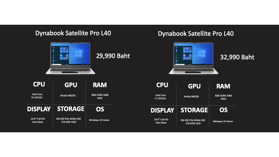 ด้วยแนวคิด Beyond Reliable Experience for Your Everyday Work ที่สุดแห่งประสบการณ์ในการทำงานกับ Dynabook โน๊ตบุ๊กรุ่น Satellite Pro L40 รุ่น Protégé X30 และรุ่น Tecra X40 จึงมีความหลากหลายของสเปคและวัสดุที่ทนทานสูงให้เลือกใช้งานได้ตามความต้องการ เหมาะอย่างยิ่งสำหรับคนทำงานที่กำลังมองหาเครื่องคู่กาย ซึ่งสามารถพกพาไปทำงานได้ทุกวัน คนที่ต้องเคลื่อนที่ตลอดเวลาและต้องการเครื่องที่ทนทาน หรือแม้แต่นักเรียนนักศึกษาที่ต้องการใช้งานทั้งที่บ้านและที่โรงเรียน ทั้งเล่นเกมและการบ้าน ทั้งยังสามารถปรับเปลี่ยนสเปกได้ตามความต้องการที่แตกต่างกันสำหรับการใช้งานในระดับองค์กรได้อีกด้วย
