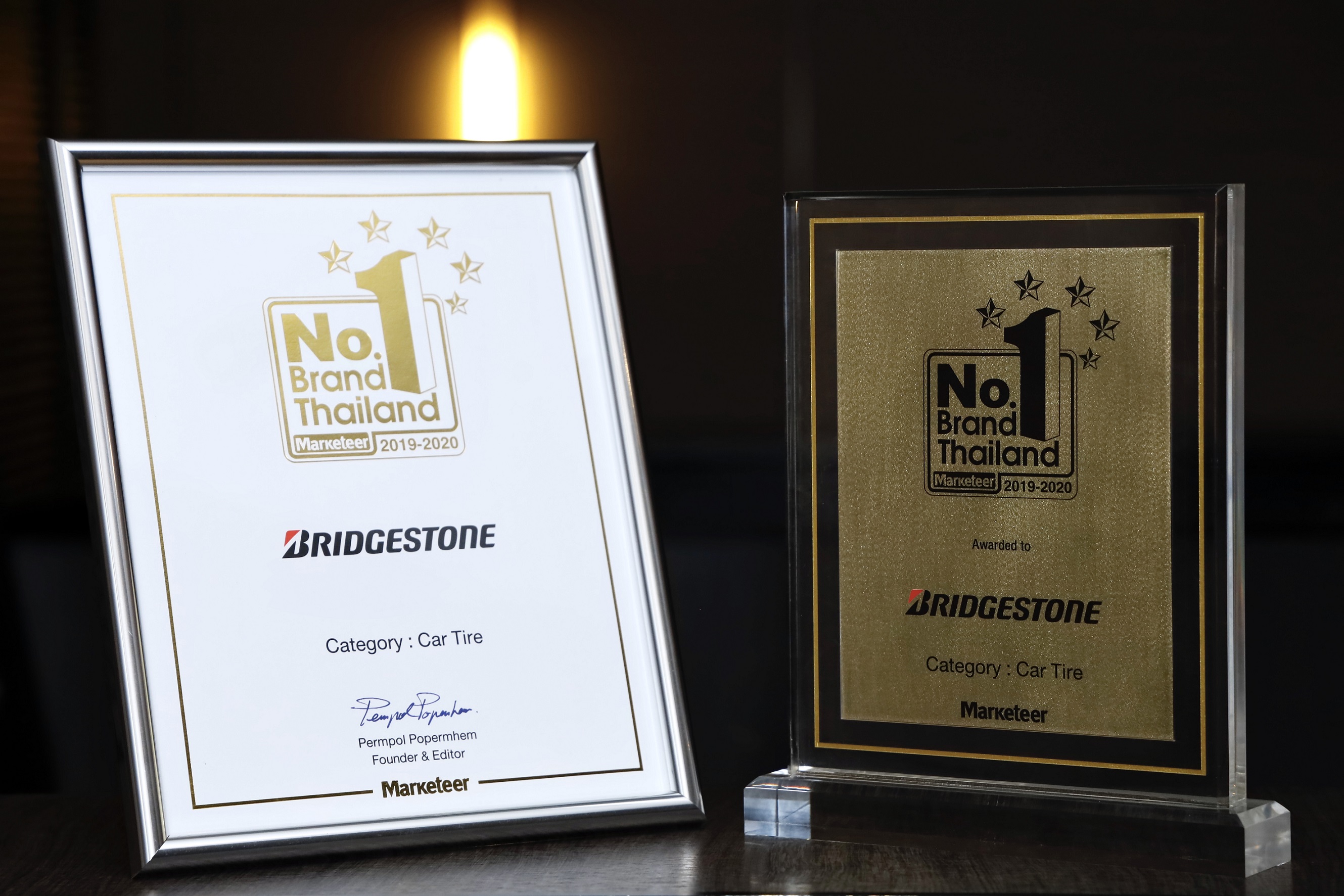 บริษัท บริดจสโตนเซลส์ (ประเทศไทย) จำกัด ตอกย้ำความเป็นผู้นำครองแบรนด์อันดับหนึ่งในตลาดยางรถยนต์ เข้ารับรางวัลอันทรงเกียรติ “แบรนด์ยอดนิยมอันดับหนึ่งของประเทศไทย” ประเภทยางรถยนต์ หรือ “No.1 Brand Thailand 2019-2020” ต่อเนื่องเข้าสู่ปีที่ 9 โดยคุณสมิทธ์ แสงไฟ ผู้จัดการส่วนงานการตลาดและกลยุทธ์ เป็นตัวแทนบริษัทฯ รับรางวัลจากนายเพิ่มพล โพธิ์เพิ่มเหม บรรณาธิการ และผู้ก่อตั้งนิตยสาร Marketeer ณ โรงแรมดิโอกุระ เพรสทีจ กรุงเทพฯ ซึ่งเป็นรางวัลที่ได้รับการคัดเลือกกว่า 1,000 แบรนด์ จากผลสำรวจความนิยมของประชาชนทั่วประเทศ สะท้อนภาพลักษณ์ความแข็งแกร่งของแบรนด์ บริดจสโตนที่ครองใจผู้บริโภคมาอย่างยาวนาน จากความมุ่งมั่น สร้างสรรค์เทคโนโลยีและพัฒนานวัตกรรมในทุกกระบวนการผลิต เพื่อส่งมอบผลิตภัณฑ์และการบริการที่ดีที่สุดบนพื้นฐานของความปลอดภัยสูงสุดตลอดทุกการเดินทางแก่ผู้บริโภค
