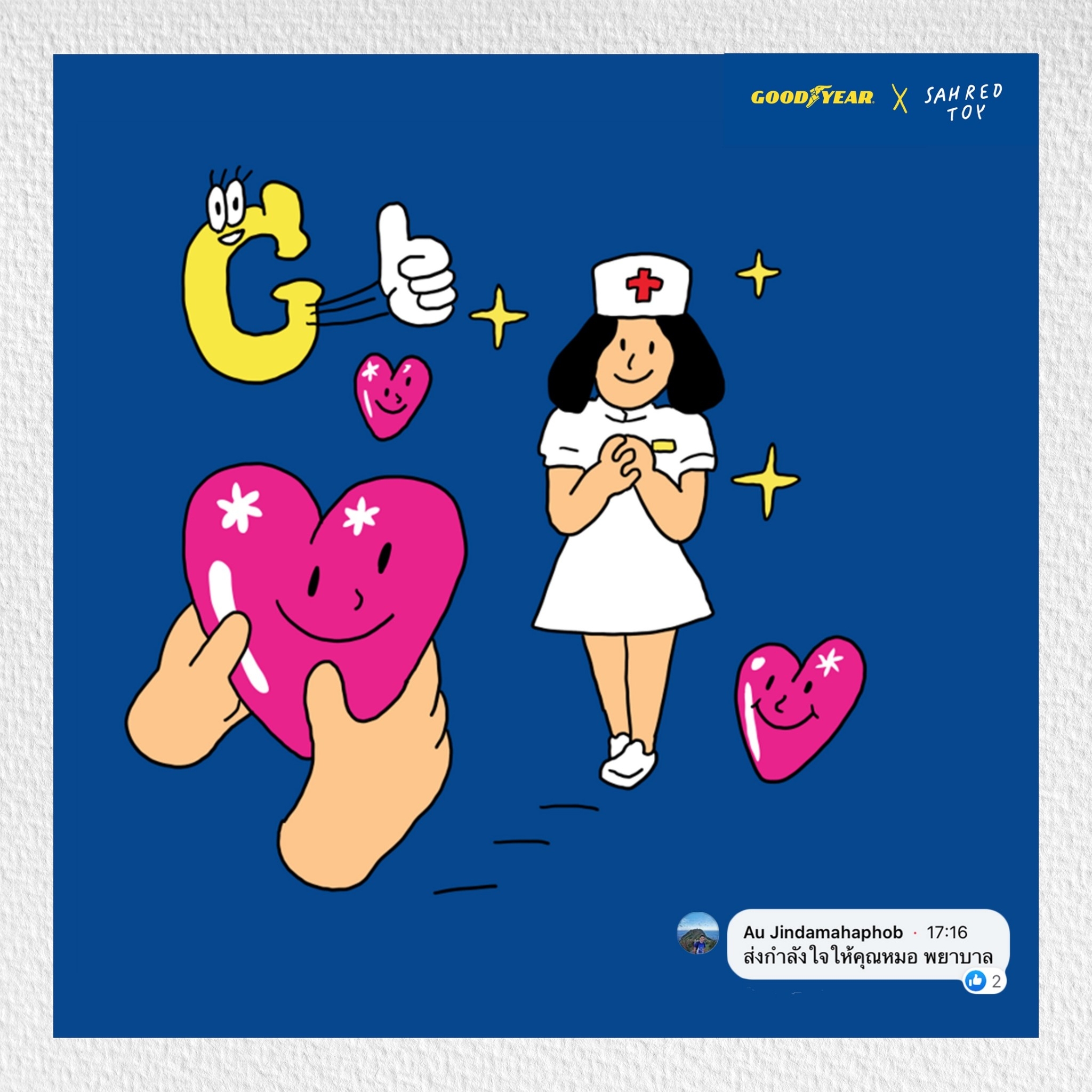 ไม่นานมานี้ เราจะเห็นแคมเปญเปิดปีใหม่ด้วยความสดใส เพื่อสร้างความสุขและรอยยิ้มของคนไทย โดย Goodyear ประเทศไทย จับมือศิลปินภาพประกอบที่มีชื่อเสียงระดับเอเชีย คุณต๊อด Sahred Toy มาสร้างสรรค์แคมเปญท่ามกลางภาวะตึงเครียดในหลาย ๆ เรื่อง เพื่อตอกย้ำภาพลักษณ์ของความเป็นแบรนด์ชั้นนำระดับโลก รวมถึงสร้างประสบการณ์ใหม่ ๆ กับผลิตภัณฑ์ยาง