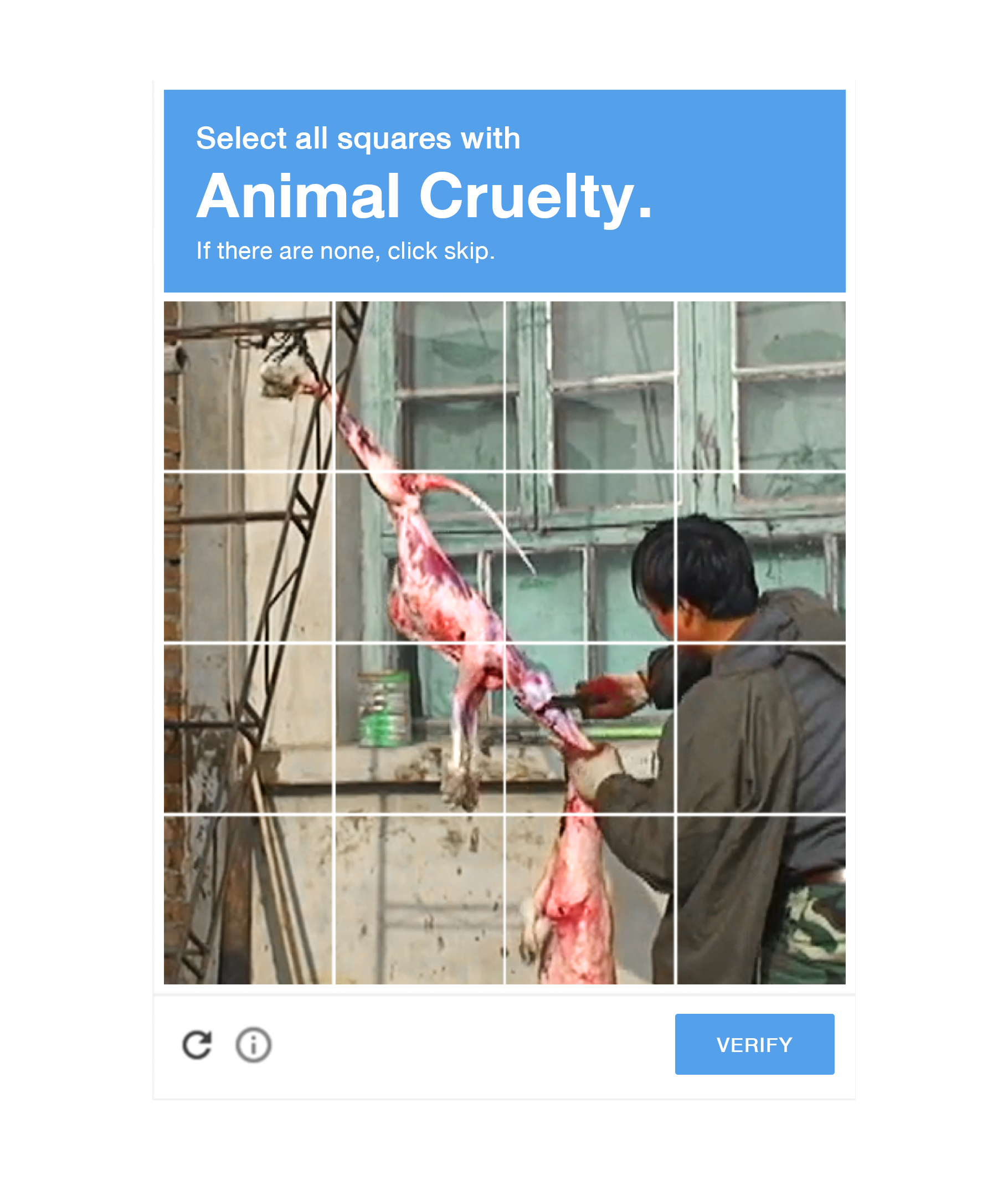 อย่างไรก็ตาม แทนที่จะขอให้ผู้ใช้การค้นหาป้ายถนนภาพที่ปรากฏจึงกลายเป็นภาพการกระทำที่โหดร้ายต่อสัตว์แทน เนื่องจากผู้ใช้ถูกขอให้ระบุรูปภาพที่มีการทารุณกรรมสัตว์เพื่อพิสูจน์ว่าพวกเขาเป็น “มนุษย์” พวกเขายังได้รับการเตือนอย่างชัดเจนถึงสาระสำคัญของสิ่งที่ทำให้มนุษย์เป็น ซึ่งก็คือมนุษย์ต้องมีความเมตตาต่อสรรพสัตว์ ลงท้ายด้วยข้อความว่า “ถ้าคุณรู้สึกบางอย่างให้หยุดสนับสนุนผลิตภัณฑ์ที่ได้มาจากการทารุณกรรมสัตว์” PETA Thailand ได้เปลี่ยนการทดสอบ CAPTCHA ที่ใช้กันทั่วไปให้กลายเป็นสื่อในการเตือนความจำที่น่าตกใจเกี่ยวกับการทารุณกรรมสัตว์