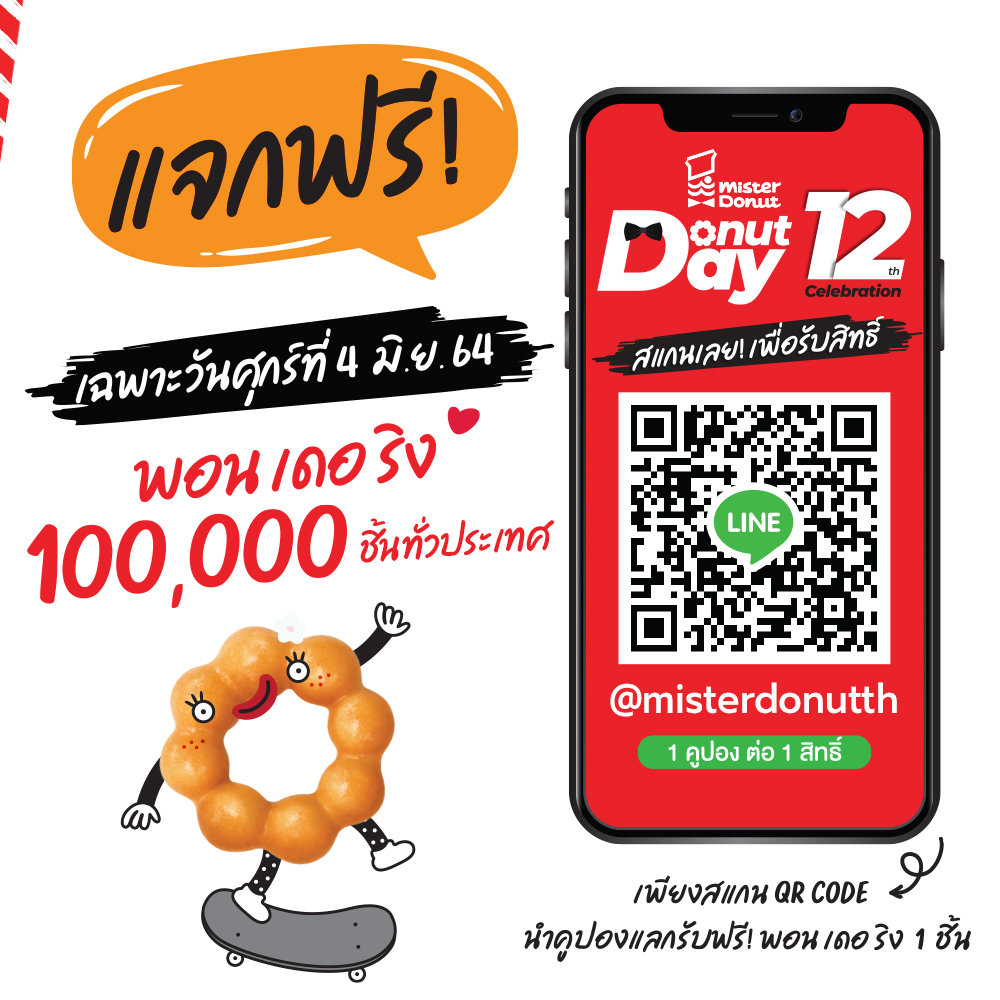 - โดนัท เดย์ – ครบรอบ 12 ปี ส่งความสุขให้กับลูกค้ามิสเตอร์ โดนัท พิเศษเฉพาะในวันศุกร์ที่ 4 มิ.ย. 64 แจกฟรี! พอน เดอ ริง จำนวน 100,000 ชิ้น เพียงสแกนคิวอาร์โค้ด จาก Line OA Mister Donut Thailand (@misterdonutth) แลกรับได้ทันที