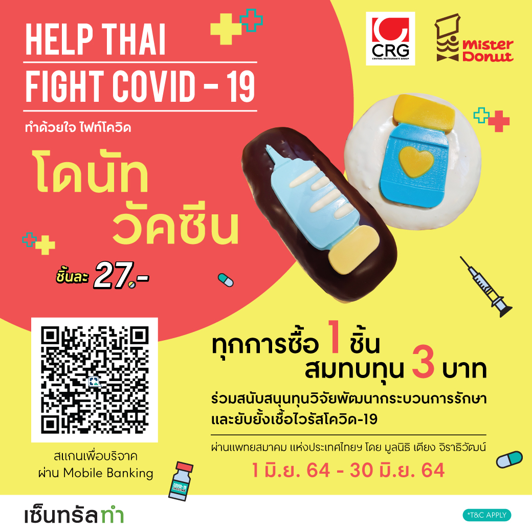 - โดนัทวัคซีน ทำด้วยใจไฟท์โควิด – สุขใจ อิ่มบุญ กับโดนัทวัคซีน 2 รสชาติ เพียงชิ้นละ 27 บาท โดยทุกการซื้อ 1 ชิ้น จะได้ร่วมสมทบทุนบริจาคชิ้นละ 3 บาท เพื่อสนับสนุนทุนวิจัยพัฒนากระบวนการรักษาและยับยั้งเชื้อไวรัสโควิด-19
