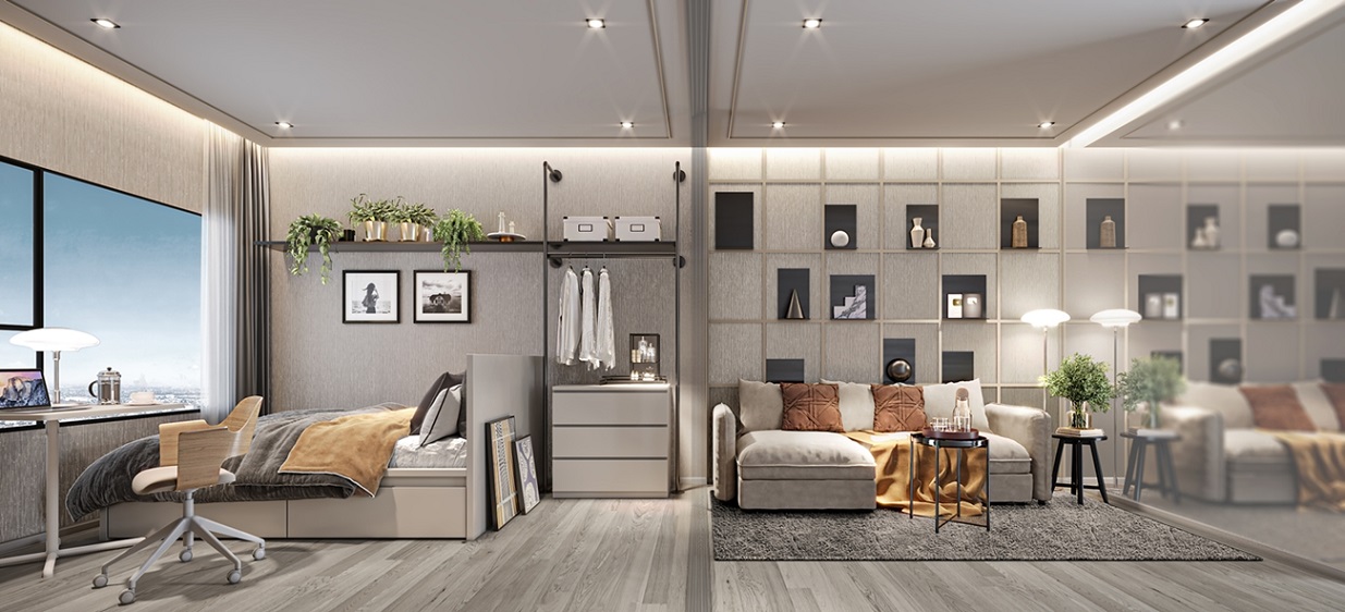 อีกหนึ่งจุดเด่นของโครงการ ครั้งแรกของการเปิดตัวผังห้องชุดดีไซน์พิเศษ ‘Multi-Functional Future’ รองรับ ไลฟ์สไตล์ที่หลากหลาย เน้นสเปซฟังก์ชันที่ ‘ยั่งยืน ยืดหยุ่น ยืนยาว’ แก้โจทย์การใช้ชีวิตโลกยุคใหม่ในคอนโด ปลดล็อกทุกความอิสระ ให้สามารถใช้งานได้ทุกตารางนิ้ว เติมเต็มให้การอยู่อาศัยในคอนโดให้รู้สึก ‘อบอุ่นและสัดส่วนเหมือนได้อยู่บ้าน’ โดยส่วนพักอาศัยเริ่มตั้งแต่ชั้น 3 – 25 มีแบบห้องชุดให้เลือก ได้แก่ ห้องชุดหนึ่งห้องนอน พื้นที่ใช้สอย 30.50 ตร.ม. ดีไซน์พื้นที่ตอบรับไลฟ์สไตล์และฟังก์ชันที่มากกว่าเดิม เริ่มตั้งแต่โถงด้านหน้า เตรียมพร้อมพื้นที่จัดเก็บรองเท้าหรือชุดครัวพร้อมอ่างล้างมือ เพื่อวางพักสิ่งของและทำความสะอาดมือที่อาจมีการปนเปื้อนจากด้านนอก ตอบเทรนด์ Well-Being & Hygiene การให้ความสำคัญกับขนาดสเปซพักผ่อน ให้ยืดหยุ่นรองรับทั้งการใช้งานทั้งการประชุมแบบเป็นทางการช่วง Work from Home สเปซห้องครัวที่ตั้งใจเลือกใช้วัสดุที่ง่ายต่อการดูแลรักษาทำความสะอาดง่าย ห้องนอนที่เน้นการตกแต่งที่ยั่งยืน พร้อมเปิดมุมมองกระจกเปิดกว้าง รับแสงแดด ลมธรรมชาติ และเทควิวเมืองเข้าสู่ยูนิตพักอาศัย และ ห้องชุดสองห้องนอน พื้นที่ใช้สอย 45 ตร.ม. ดีไซน์พื้นที่หน้ากว้าง 8 เมตร เต็มอิ่มกับทุกพื้นที่ได้อย่างเป็นสัดส่วน ตั้งแต่ส่วนพักผ่อนขนาดใหญ่ที่รองรับการปรับเปลี่ยนฟังก์ชันการใช้งานได้หลากหลาย พร้อมเชื่อมต่อไปยังส่วนรับประทานและสเปซครัวแบบปิด ในขณะที่ห้องนอนพร้อมสเปซ Walk in closet และกระจกบานใหญ่ ให้บรรยากาศความอบอุ่นและความหรูหราในเวลาเดียวกัน