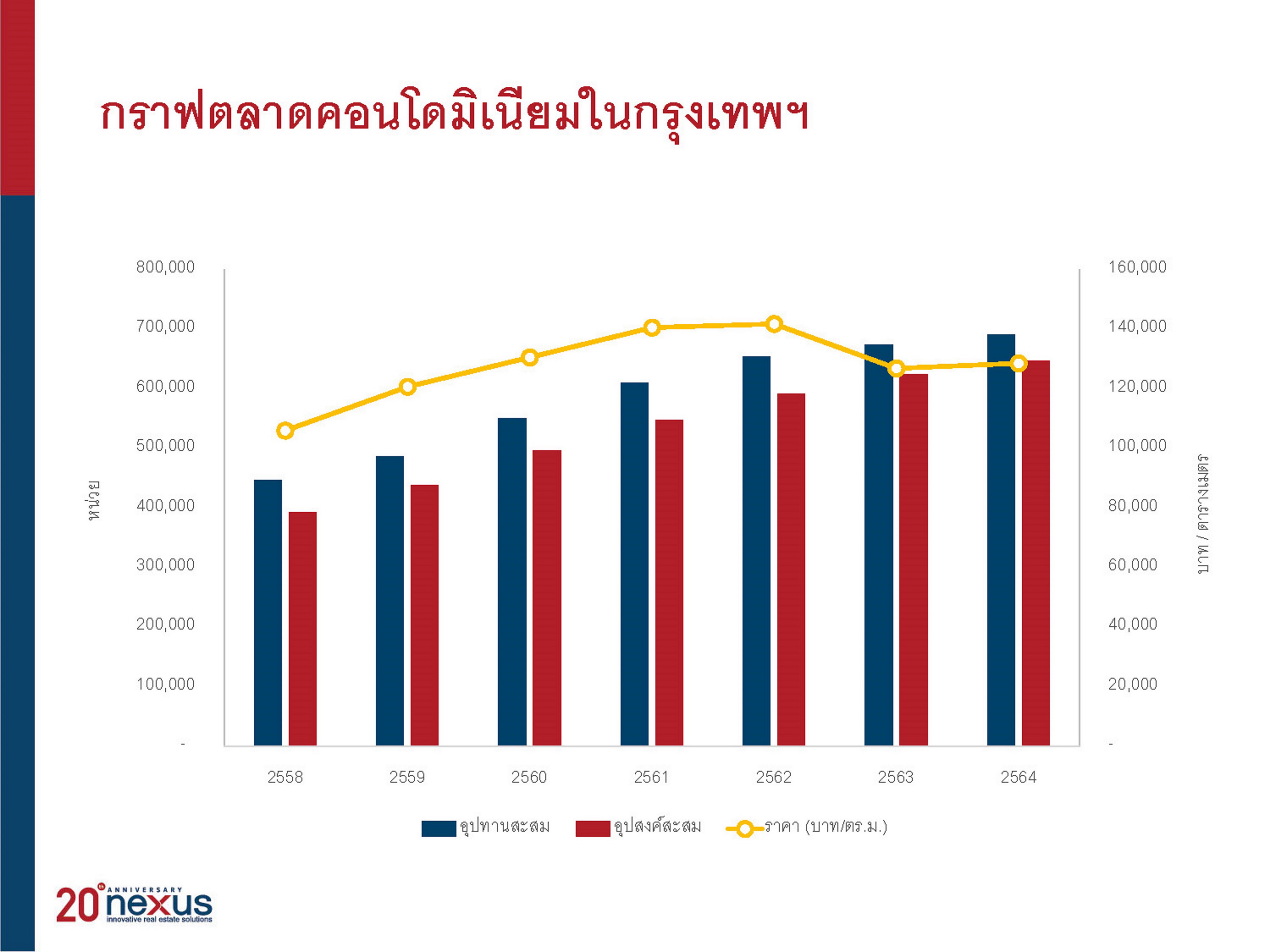 “ทั้งนี้ จากผลวิจัยข้อมูลในช่วง 20 ปีของเน็กซัสพบว่า ณ สิ้นปี พ.ศ. 2564 อุปทานของคอนโดมิเนียมในตลาดกรุงเทพฯ และปริมณฑลมีทั้งหมด 694,000 หน่วย การเติบโตของอุปทานแบ่งออกเป็น 3 ไซเคิลหลัก โดยในช่วงแรก ปี พ.ศ. 2544-2552 การพัฒนาคอนโดมิเนียมส่วนใหญ่ จะกระจุกตัวอยู่ใจกลางเมืองและบริเวณรอบใจกลางเมือง จำนวนหน่วยที่พัฒนาสะสมมีอยู่ 123,000 หน่วย ตลาดเริ่มเปลี่ยนแปลงอย่างเห็นได้ชัดในไซเคิลที่ 2 ช่วงปี พ.ศ. 2553-2561 การพัฒนาขยายตัวออกไปในทำเลรอบนอกมากขึ้น และมีดีเวลลอปเปอร์รายใหม่เข้ามาในตลาดมากขึ้น อุปทานเพิ่มขึ้นอย่างก้าวกระโดด โดยมีอุปทานสะสมในช่วง 8 ปีเพิ่มขึ้นถึง 482,000 หน่วย อย่างไรก็ดี ในช่วงไซเคิลที่ 3 ช่วงปี พ.ศ. 2562-2664 ตลาดหดตัวลงอย่างมาก เนื่องจากได้รับผลกระทบจากปัจจัยทางเศรษฐกิจและเหตุการณ์ไม่คาดฝันอย่างโควิด-19 โดยในช่วง 3 ปีที่ผ่านมามีอุปทานเพิ่มขึ้นเพียง 80,100 หน่วย ซึ่งในปี พ.ศ. 2564 มีคอนโดมิเนียมเปิดใหม่เพียง 16,800 หน่วยเท่านั้น นับว่าต่ำที่สุดในรอบ 12 ปี”
