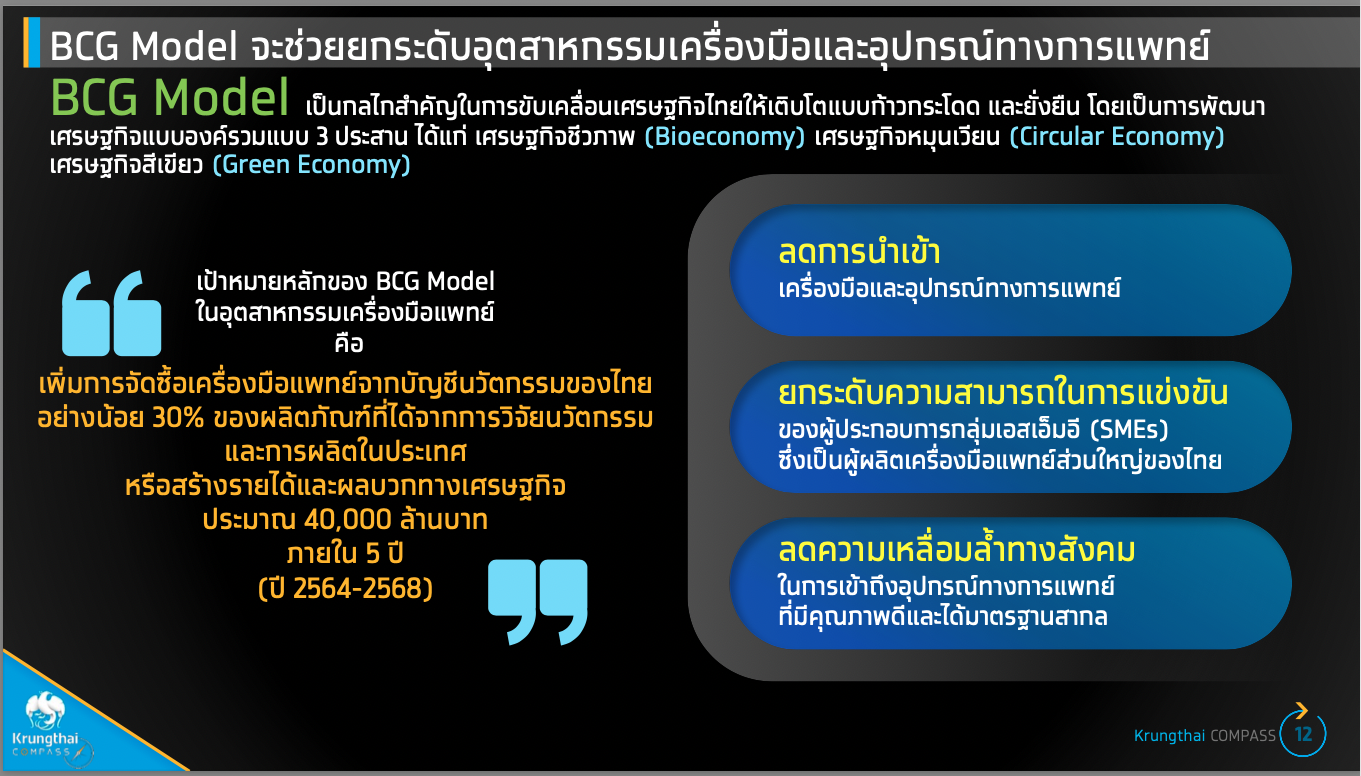 2. การยกระดับอุตสาหกรรมเครื่องมือและอุปกรณ์ทางการแพทย์ด้วย BCG Model ซึ่งจะช่วยให้ผู้ประกอบการไทยสามารถผลิตเครื่องมือและอุปกรณ์ทางการแพทย์ที่มีนวัตกรรมและใช้เทคโนโลยีขั้นสูงได้มากขึ้น และจะส่งผลให้มูลค่าตลาดอุตสาหกรรมนี้ของไทยมีโอกาสแตะระดับ 3.38 พันล้านดอลลาร์สหรัฐ หรือกว่าแสนล้านบาท ในปี 2027 คิดเป็นอัตราเติบโตเฉลี่ย 8.1% ต่อปี เพิ่มขึ้นเกือบ 2 เท่า จากปี 2019 และสูงกว่าอัตราเติบโตเฉลี่ยของตลาดโลก
