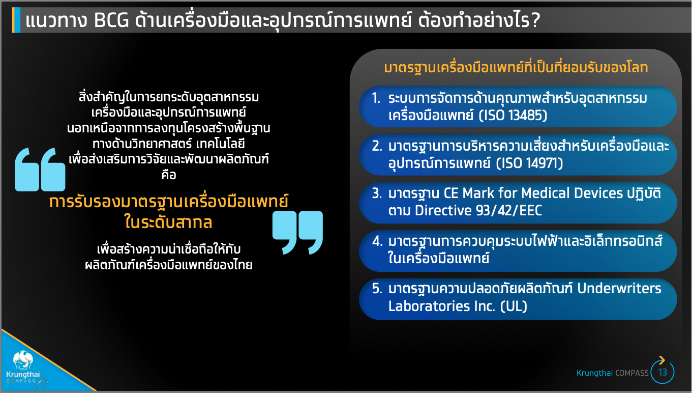 ดร.พชรพจน์ นันทรามาศ ผู้ช่วยกรรมการผู้จัดการใหญ่ ธนาคารกรุงไทย เปิดเผยว่า อุตสาหกรรมการแพทย์เป็นหนึ่งในอุตสาหกรรมเป้าหมายที่ภาครัฐคาดหวังว่าจะเป็นฟันเฟืองสำคัญที่จะช่วยขับเคลื่อนเศรษฐกิจไทยท่ามกลางวิกฤตการแพร่ระบาดของโควิด-19 เช่นนี้ โดยมุ่งหวังที่จะผลักดันไทยก้าวเข้า Medical Hub อย่างเต็มรูปแบบ
