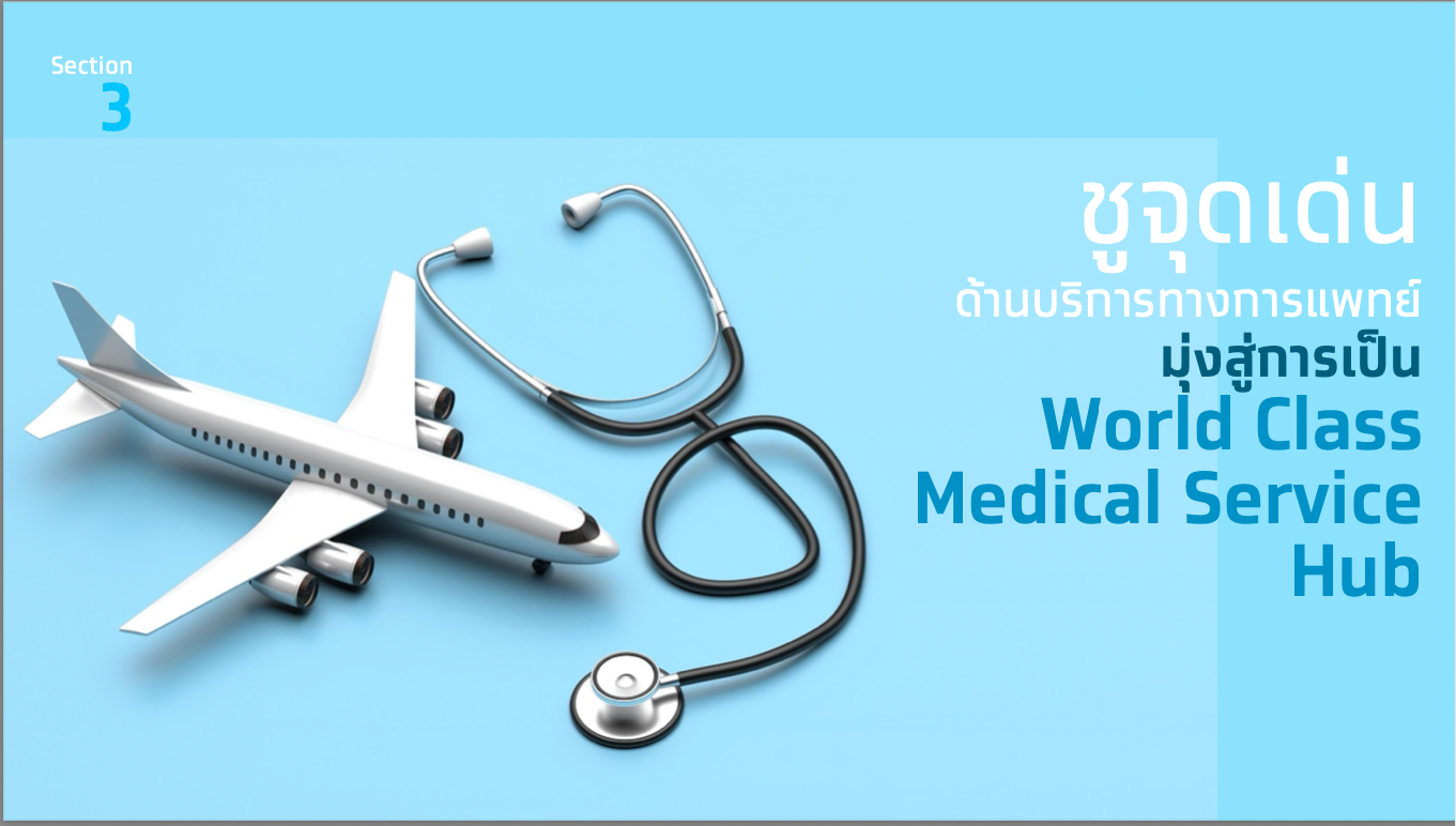 3. การชูจุดเด่นด้านบริการทางการแพทย์เพื่อมุ่งสู่การเป็น World Class Medical Service Hub ซึ่งคาดว่ามูลค่าตลาดท่องเที่ยวเชิงการแพทย์ของไทยจะกลับมาขยายตัวได้อีกครั้งหลังสถานการณ์การแพร่ระบาดของโควิด-19 คลี่คลายลง แตะระดับ 7.6 แสนล้านบาทในปี 2027 หรือเติบโตเฉลี่ย 13.2% ต่อปี