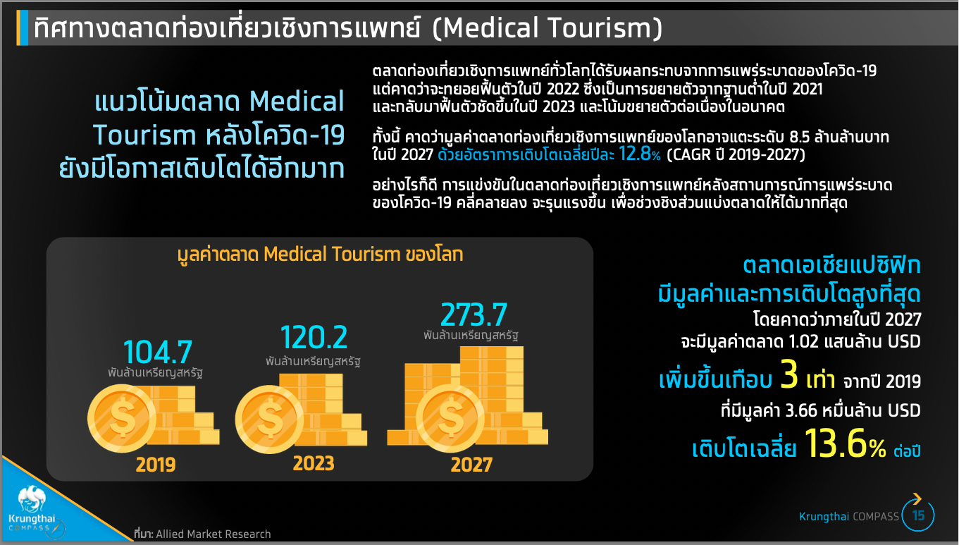 ศูนย์วิจัย Krungthai COMPASS ชี้ การยกระดับ 3 อุตสาหกรรมการแพทย์สำคัญ ได้แก่ อุตสาหกรรมชีวเภสัชภัณฑ์ (Biopharmaceuticals) อุตสาหกรรมเครื่องมือและอุปกรณ์การแพทย์ และอุตสาหกรรมท่องเที่ยวเชิงการแพทย์ จะช่วยหนุนไทยสู่เป้าหมายการเป็น Medical Hub และช่วยสร้างรายได้เข้าประเทศถึง 8 แสนล้านบาทต่อปีในปี 2027 จากปัจจุบันที่มีมูลค่าประมาณ 2 แสนกว่าล้านบาท ด้วยเพราะเป็นเทรนด์โลกที่จะเติบโตสูง คิดเป็นมูลค่าตลาดรวมกว่า 1.5 ล้านล้านดอลลาร์สหรัฐต่อปีในปี 2027