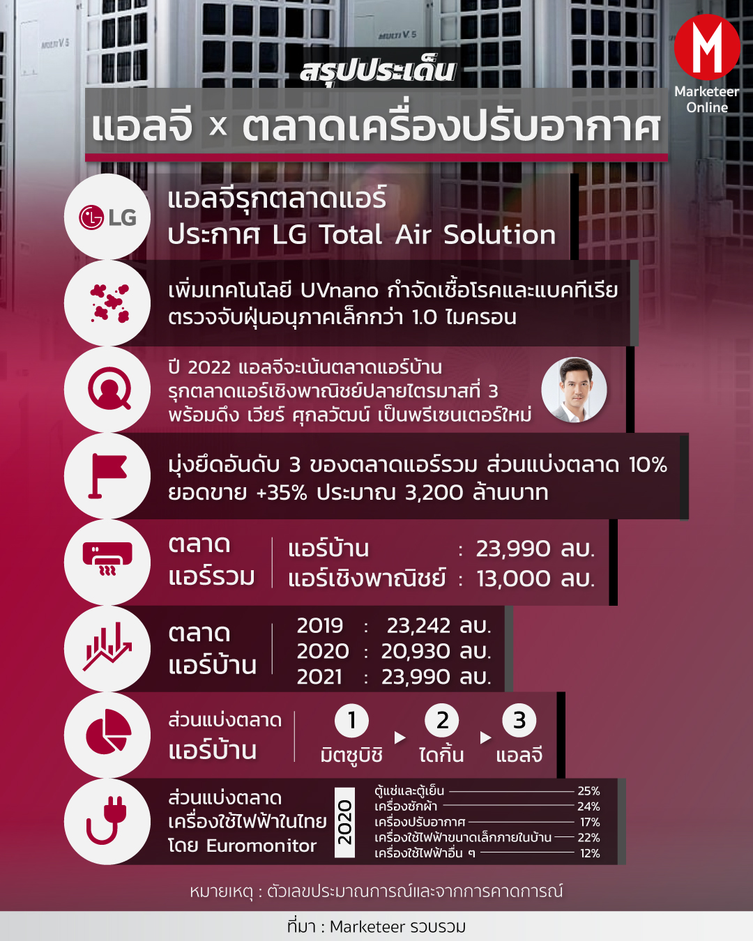 โดยในปี 2022 LG จะเน้นหนักไปที่ตลาดของเครื่องปรับอากาศในครัวเรือน และจะเริ่มรุกตลาดเครื่องปรับอากาศพาณิชย์ในปลายไตรมาสที่ 3 ของปีนี้ และยังทุ่มงบการตลาดกว่า 250 ล้านบาท เพื่อสอดรับกับตัวเลขความเติบโตที่ต้องการ โดยได้ดึง เวียร์ ศุกลวัฒน์ มาเป็นพรีเซนเตอร์คนใหม่อีกด้วย