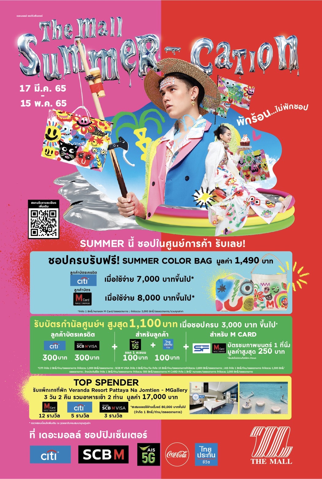 - Top Spender ลุ้นรับที่พักรับหน้าร้อน วีรันดา รีสอร์ท พัทยา นาจอมเทียน ห้องพัก Sea Breeze รวมอาหารเช้าสำหรับ 2 ท่าน จำนวน 3 วัน 2 คืน จำนวน 20 รางวัล มูลค่ารางวัลละ 17,000 บาท เมื่อมียอดใช้จ่าย ตั้งแต่ 80,000 บาทขึ้นไปตลอดรายการ รับ Summer Bag สุดพิเศษ มูลค่า 1,490 บาท เมื่อใช้จ่ายครบ 8,000 บาทขึ้นไป สำหรับผู้ถือบัตรเครดิต CITI ช้อปเพียง 7,000 บาท เฉพาะที่เดอะมอลล์ไลฟ์สโตร์ ท่าพระ และงามวงศ์วาน พิเศษ On Top รับ Travelling Bag กระเป๋า ช้อปปิ้งซัมเมอร์ ลิมิเต็ด อิดิชั่น 1 ใบ เมื่อใช้จ่ายในห้างฯ และ ศูนย์ฯ ตั้งแต่ 5,000 บาทขึ้นไป (17 มี.ค. 2565-17 เม.ย. 2565)