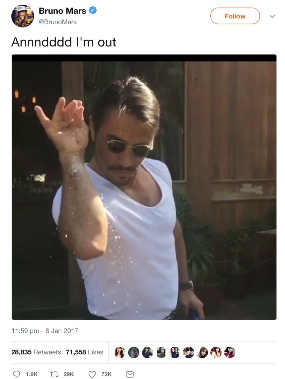 เขาได้รับกระแสต้อนรับมากขึ้นเมื่อ Bruno Mars (บรูโน่ มาร์ส) โพสต์รูปภาพของ Nusret Gokce ขณะทำท่า Salt Bae พร้อมคำบรรยายใต้ภาพ “Annndddd I’m out” ผ่าน Twitter ผู้คนจึงเริ่มพูดถึง Nusret Gokce เพิ่มขึ้นกว่าเดิมและเกิดมีมขึ้น