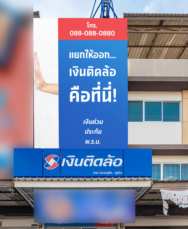 “เงินติดล้อ” เลือกทำตลาดแบบ Localized Marketing โดยการใช้สื่อ Out of Home หรือป้ายบิลบอร์ดโฆษณา เพื่อสื่อสารกับลูกค้ากลุ่มเป้าหมาย แน่นอนว่าป้ายโดน ๆ แบบนี้สะดุดตาสะดุดใจผู้สัญจรเป็นอย่างมาก
