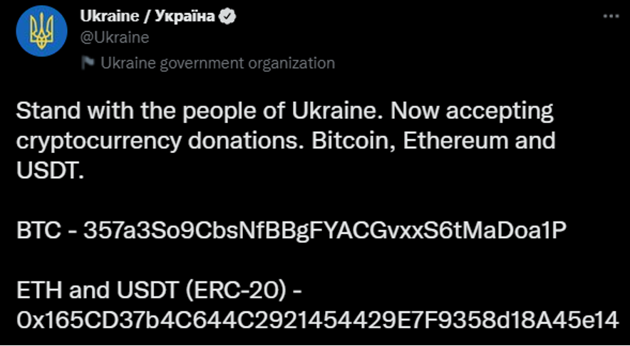 Mykhailo Fedorov รัฐมนตรีว่าการกระทรวงดิจิทัลของยูเครน เข้ารับตำแหน่งได้ 2 วัน รัสเซียก็บุกยูเครน เขาไม่รอช้าผุดโปรเจกต์รับบริจาคเพื่อสนับสนุนยูเครนในการสู้ศึกสงคราม แต่จะรับบริจาคเป็นสกุลเงินเฟียตก็อาจจะเจอกฎเกณฑ์ข้อจำกัดต่าง ๆ รวมถึงอาจจะทำให้ผู้บริจาคเกิดความไม่มั่นใจว่าเงินที่บริจาคไปถูกนำไปใช้ตรงวัตถุประสงค์หรือไม่