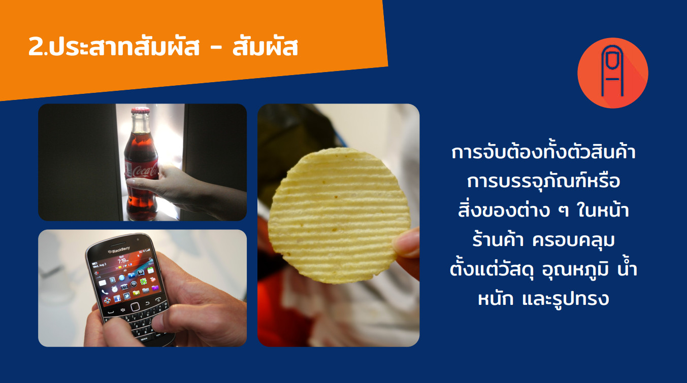 2. สัมผัส การจับต้องทั้งตัวสินค้า การบรรจุภัณฑ์หรือสิ่งของต่าง ๆ ใบหน้า ร้านค้า ครอบคลุมตั้งแต่วัสดุ อุณหภูมิ น้ำหนัก และรูปทรง เช่น แผ่นเลย์ ขวดโค้ก โทรศัพท์ Blackberry