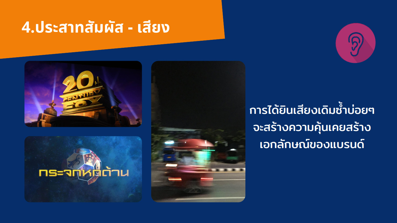 4. เสียง การได้ยินเสียงเดิมซ้ำบ่อย ๆ จะสร้างความคุ้นเคยสร้างเอกลักษณ์ของแบรนด์ เช่น เสียงรถวอลล์ เสียงของ 20 Century Fox ก่อนดูหนัง เสียงเพลงอินโทรรายการกระจกหกด้าน และ