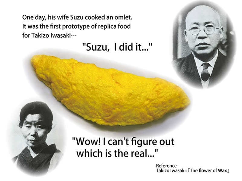 Iwasaki Takizoจึงได้รับแรงบันดาลใจในการสร้างโมเดลอาหารขึ้นเป็นครั้งแรก เขามีความคิดที่จะสร้างอาหารจำลองขึ้นมาด้วยไขของเทียน โดยเขาเริ่มจาก Omuraisu หรือข้าวห่อไข่ เมนูอาหารธรรมดา ๆ ที่ทำได้ง่ายในทุกครอบครัว