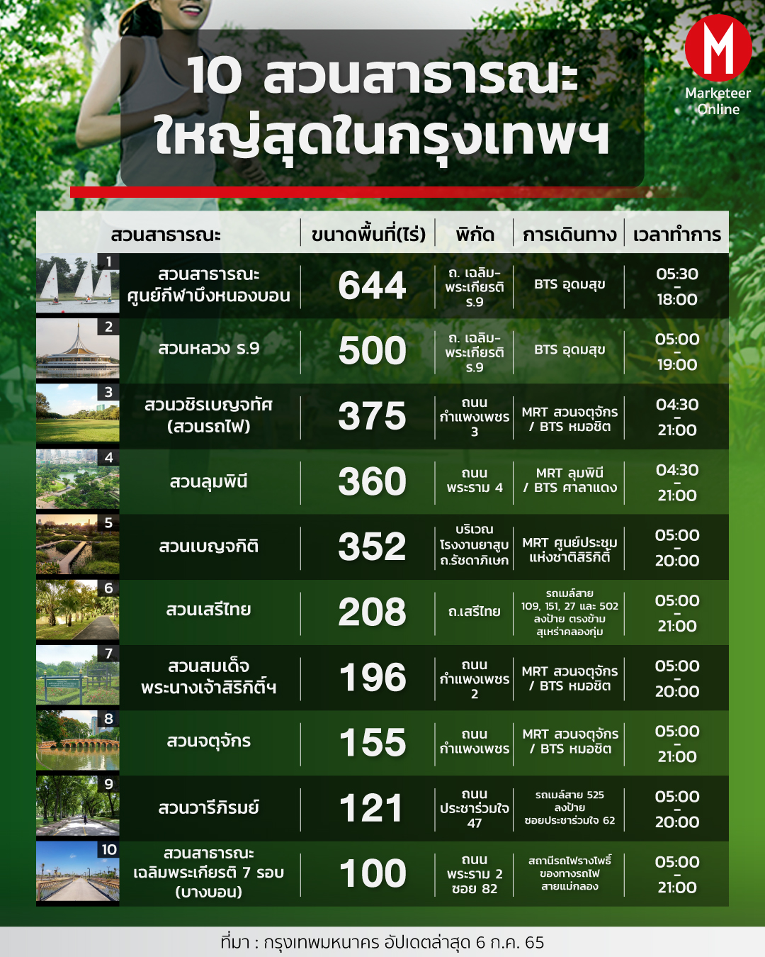 Marketeer พามาสำรวจ 10 อันดับแรก สวนสาธารณะหลักของกรุงเทพฯ ที่มีพื้นที่มากสุดปี 2565 รับกิจกรรมสันทนาการทั่วพับลิคสเปซในกรุงเทพฯ ที่กำลังคึกคักในช่วงนี้กัน
