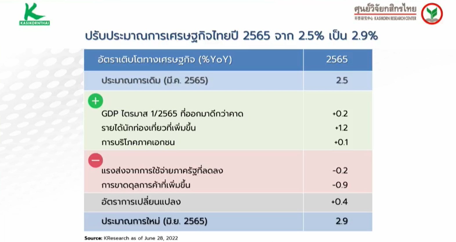 ศูนย์วิจัยกสิกรไทยปรับเพิ่มประมาณการ GDP ในปี 65 เป็น 2.9% ขณะที่ได้คาดการณ์ว่าตัวเลขเงินเฟ้อในไตรมาส 3 อาจพุ่งสูงสุดแตะ 7.4% และไทยยังมีความเสี่ยงต่อภาวะตึงตัวของอุปทานอาหาร
