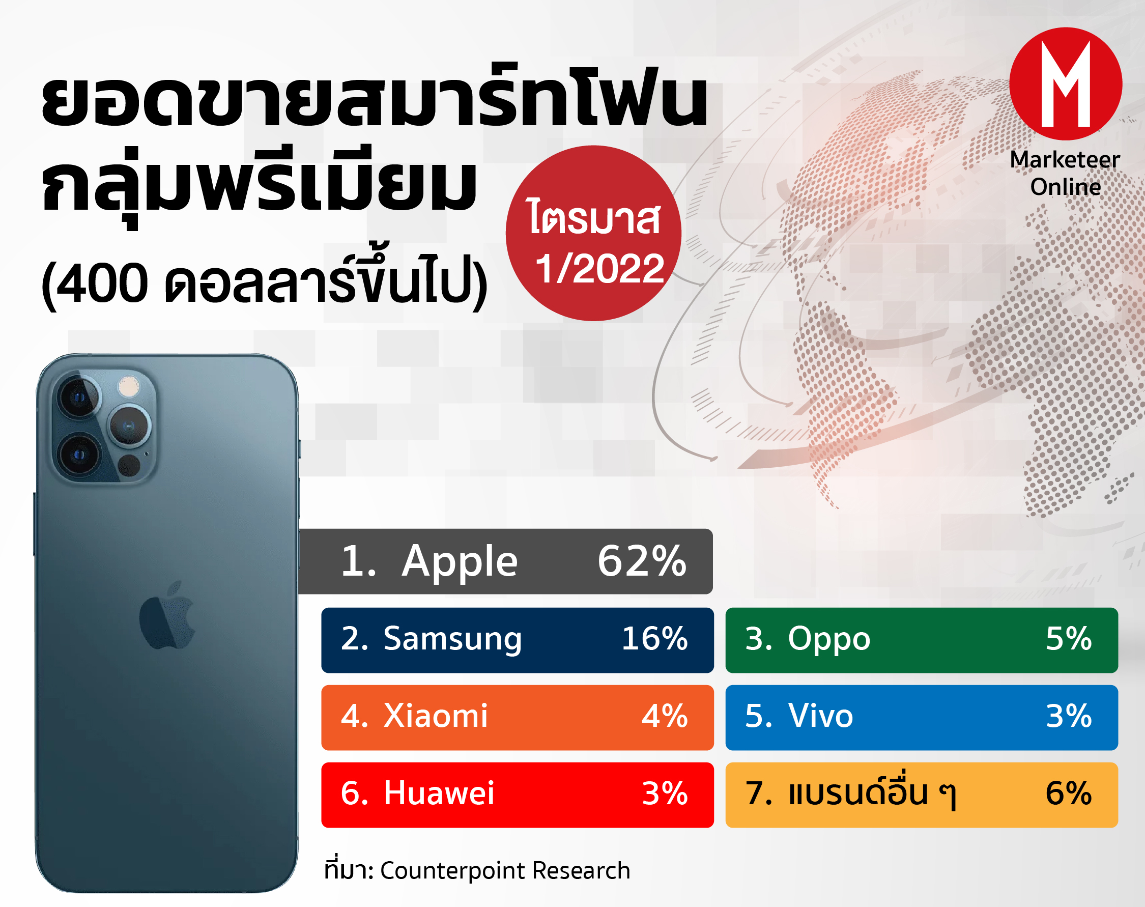 Counterpoint Research เผยรายงานยอดขายสมาร์ตโฟนกลุ่มพรีเมียม (400 ดอลลาร์ขึ้นไป) ไตรมาส 1/2022 Apple ยังครองส่วนแบ่งตลาดเกินครึ่ง 62% ส่วน Samsung ตามมาห่าง ๆ ที่ 16%