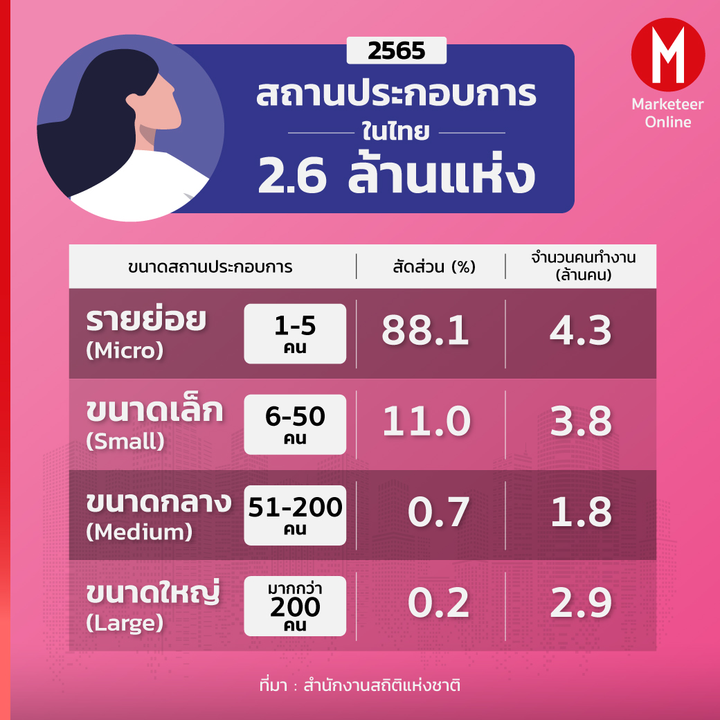 โดยที่โครงสร้างของสถานประกอบการในประเทศไทย ส่วนใหญ่กว่า 88.1% มีลักษณะเป็นสถานประกอบการรายย่อย (Micro) ตามมาด้วยสถานประกอบการขนาดเล็ก (Small) และขนาดกลาง (Medium) ขณะที่ขนาดใหญ่ (Large) คิดเป็น 0.2% ของประเทศเท่านั้น