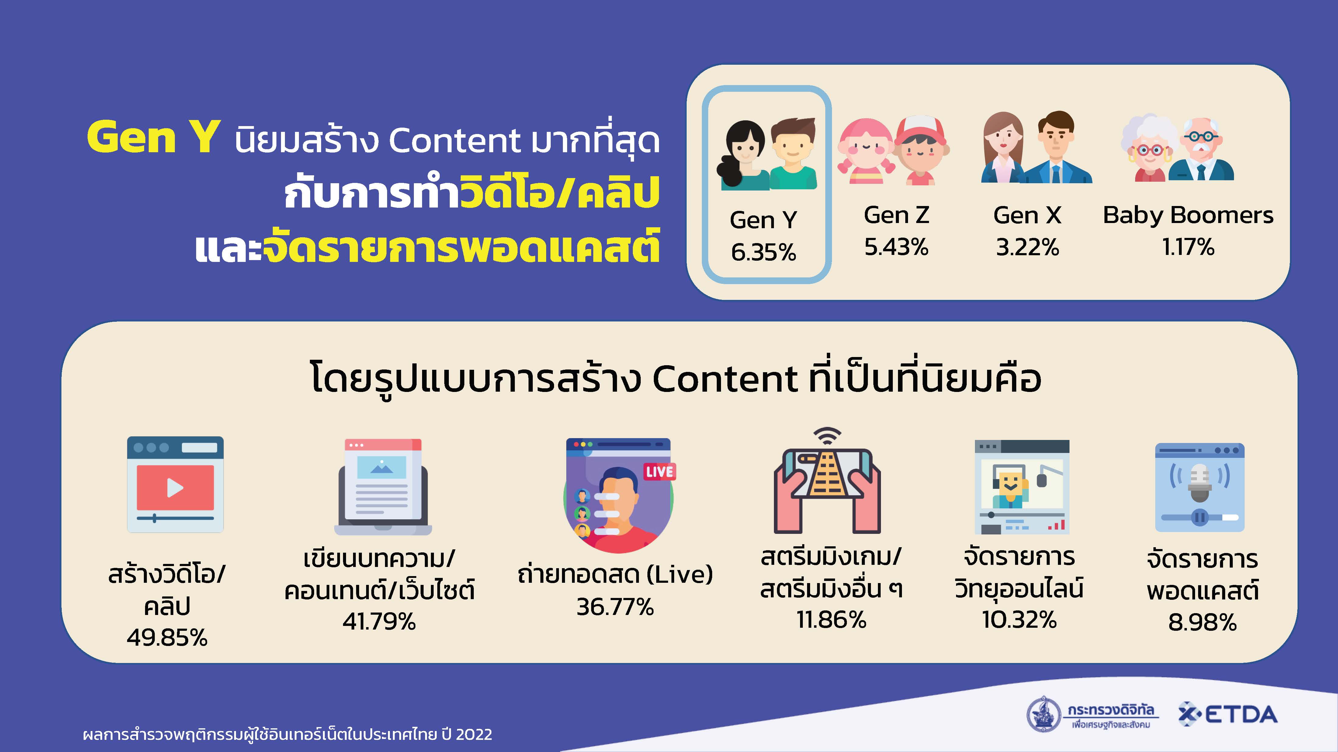 เนื่องจากเป็น Gen ที่นิยมสร้าง Online Content มากที่สุด โดยประเภท Content ที่นิยมสร้างมากที่สุด คือ วิดีโอ/คลิป 49.85% เขียนบทความ/คอนเทนต์/เว็บไซต์ 41.79% ถ่ายทอดสด (Live) 36.77% สตรีมมิ่งเกม/สตรีมมิ่งอื่น ๆ 11.86% จัดรายการวิทยุออนไลน์ 10.32% และจัดรายการพอดแคสต์ 8.98%