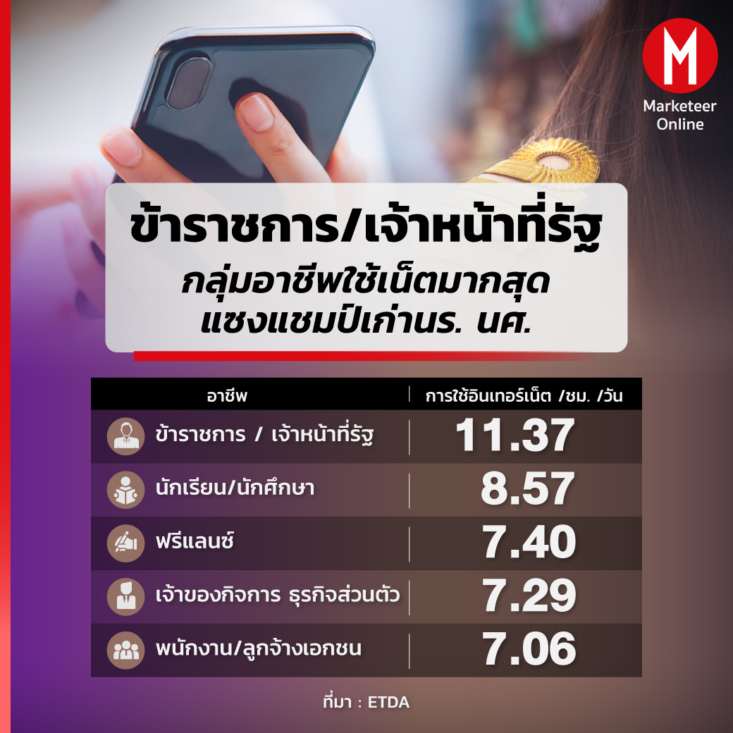 แต่เมื่อพิจารณาตามอาชีพพบข้อมูลใหม่ที่น่าสนใจมาก เพราะข้าราชการ/เจ้าหน้าที่รัฐ ติดอันดับ 1 ที่มีการใช้อินเทอร์เน็ตต่อวันมากที่สุด เมื่อเทียบกับอาชีพอื่น อยู่ที่ 11 ชั่วโมง 37 นาที สะท้อนให้เห็นถึงความสนใจ รวมถึงความพร้อมของบุคลากรภาครัฐ ในการยกระดับการทำงานสู่ยุคดิจิทัล ด้วยการทำงานแบบอิเล็กทรอนิกส์ หรือ e-Office มากขึ้น