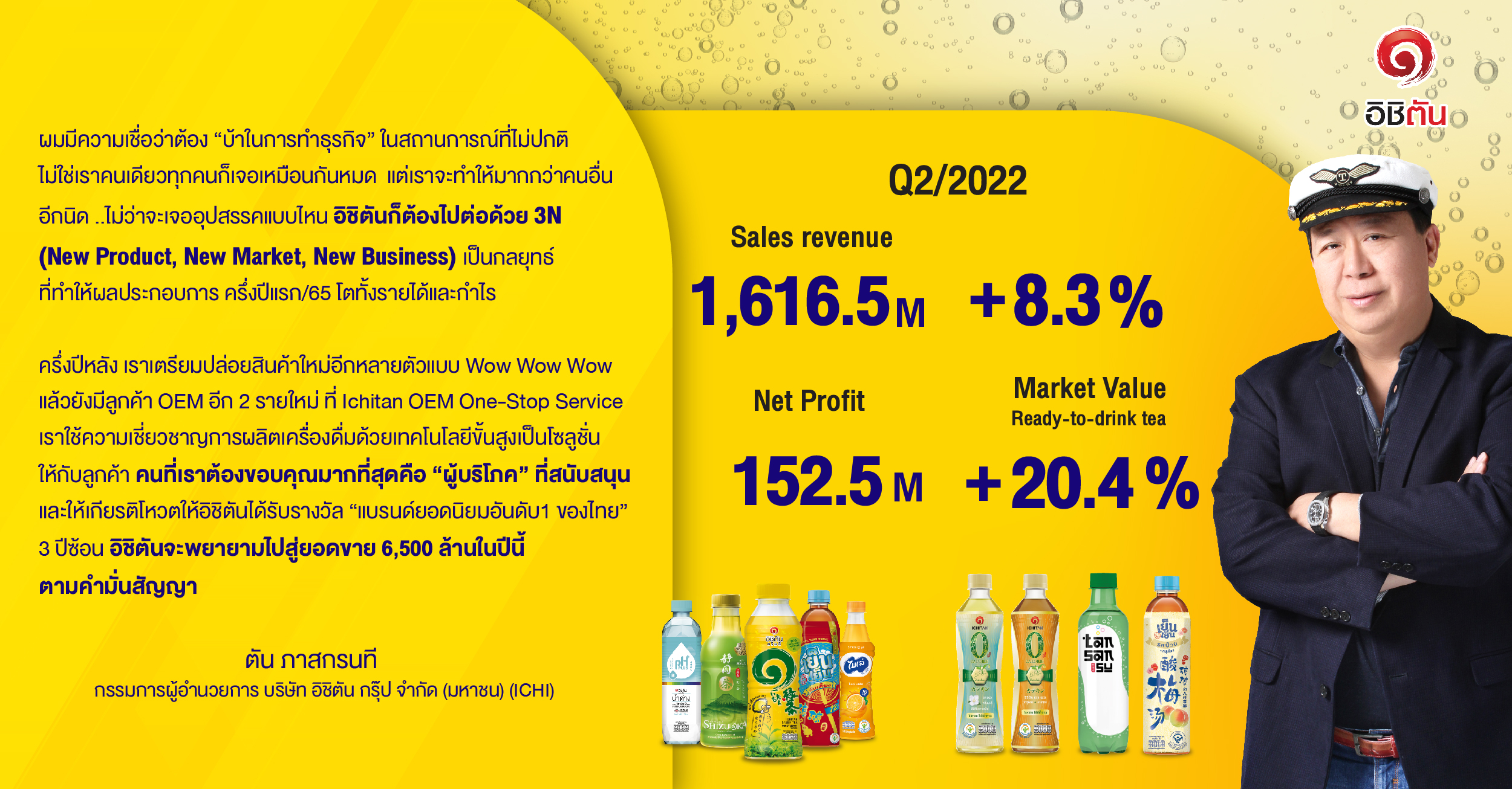 นายตัน ภาสกรนที กรรมการผู้อำนวยการ บริษัท อิชิตัน กรุ๊ป จำกัด (มหาชน) หรือ ICHI เผยว่า ภาพรวมธุรกิจครึ่งแรก ปี 2565 มีรายได้จากการขาย 3,058.8 ล้านบาท เพิ่มขึ้น 10% กำไรสุทธิ 256.5 ล้านบาท คิดเป็นอัตรากำไรสุทธิ 8.4% โดยรายได้เติบโตสวนทางตลาดเครื่องดื่มประเทศไทย และคาดว่าจะเติบโตต่อเนื่องในครึ่งหลัง ปี 2565