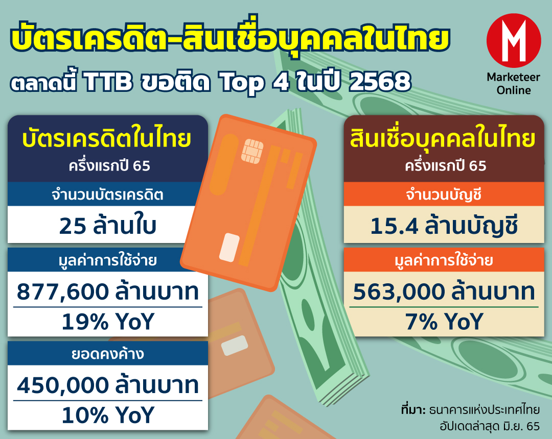 ทีทีบี รุกหนักตลาดบัตรเครดิต-สินเชื่อบุคคลในไทย หลังครึ่งแรกปี 65 ขยายตัวต่อเนื่อง ส่งโซลูชันการเงินครบวงจร ผ่าน 3 กลยุทธ์สำคัญ ตั้งเป้า 1 ใน 4 ผู้นำตลาดนี้ ภายใน 3 ปี (2566-68)