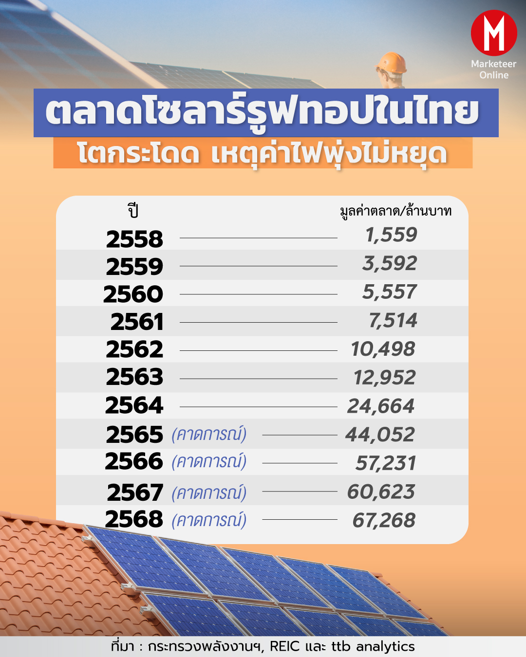 ttb analytics ประเมินมูลค่าตลาดโซลาร์รูฟทอปในไทยจะเติบโตเฉลี่ยปีละ 22% นับตั้งแต่ปี 2565–2568 หรือแตะที่ระดับ 6.7 หมื่นล้านบาท จากค่าแผงโซลาร์เซลล์และค่าติดตั้งที่ปรับลดลงจนทำให้ระยะเวลาคืนทุนเร็วขึ้นจากเดิมที่คืนทุนในเวลา 9-12 ปี เป็น 6-8 ปีในปัจจุบัน (ขึ้นอยู่กับปริมาณการใช้ไฟฟ้าในช่วงกลางวัน)
