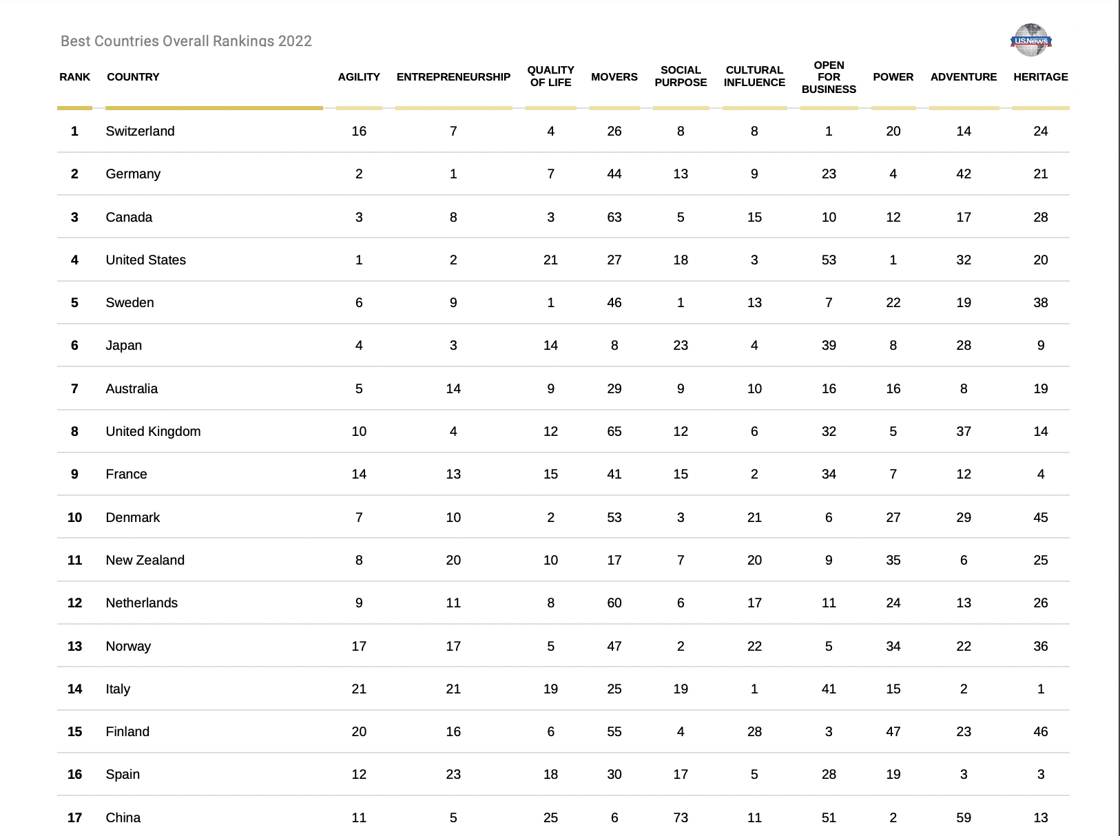 สำนักข่าว US News & World Report ร่วมกับ บริษัท BAV Group ผู้นำการวิจัยการตลาด, WPP บริษัทโฆษณาการตลาดที่ใหญ่ที่สุดในโลก และมหาวิทยาลัยเพนซิลเวเนีย ทำการสำรวจวิจัยและจัดอันดับ Best Countries ประเทศที่ดีที่สุดประจำปี 2022