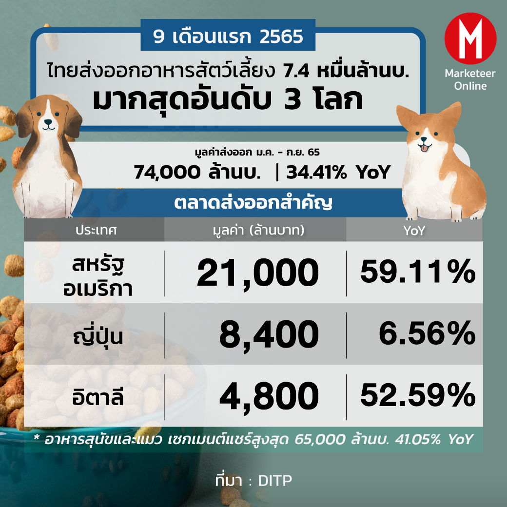 โดย 9 เดือนแรก (ม.ค.-ก.ย.) ปี 2565 ไทยส่งออกอาหารสัตว์เลี้ยง รวมมูลค่า 74,975.65 ล้านบาท โต 34.41% YoY และขยายตัวต่อเนื่องมา 37 เดือน ดันไทยขึ้นเป็นผู้ส่งออกอันดับ 3 ของโลก รองจากเยอรมนี และสหรัฐอเมริกา ทั้งเชื่อมั่นว่าในอนาคตไทยมีศักยภาพพอจะขึ้นเป็นอันดับ 1 ของโลกในการส่งออกอาหารสัตว์เลี้ยง