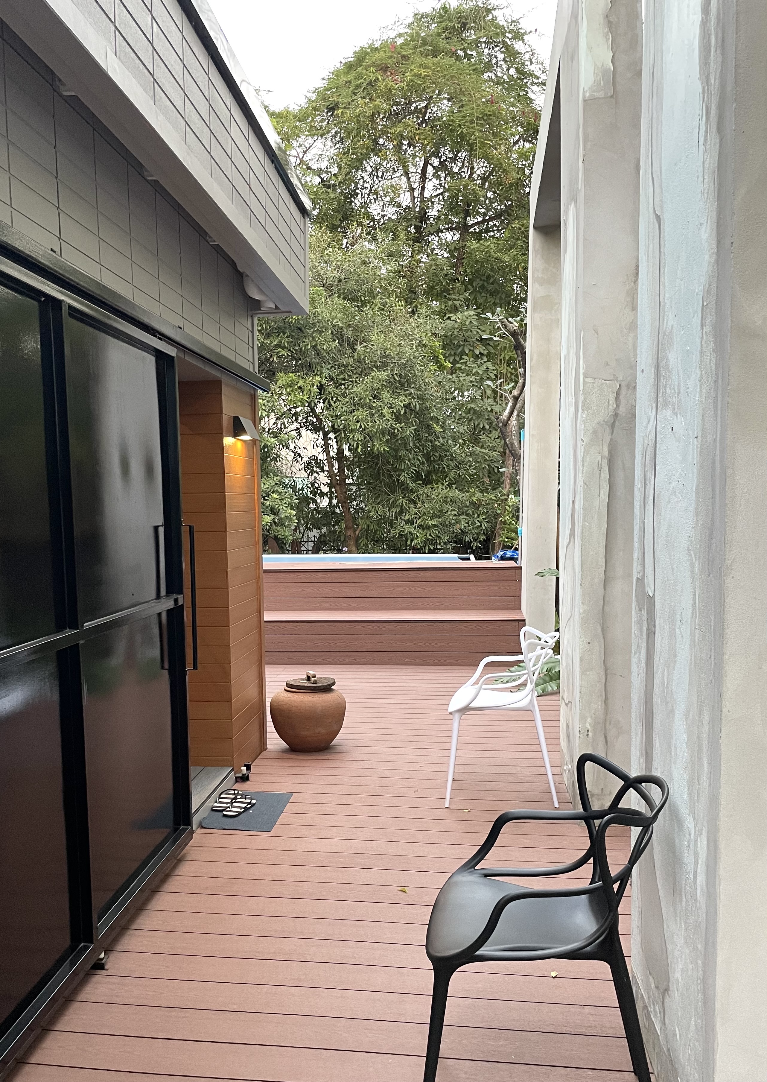 ให้เป็นไปตามแนวคิดว่าด้วยความยั่งยืน (Sustainability) ให้เข้ากับแบบแผนชีวิตปกติใหม่อยู่ติดบ้านมากขึ้น โดยทุบทิ้งอาคารคอนกรีตเดิมไปหนึ่งในสาม ลดพื้นที่กักเก็บความร้อนไปพอสมควร เปิดพื้นที่ให้โล่ง และเปิดทางลมให้ถ่ายเทมากขึ้น ขณะลดพื้นที่ซึ่งใช้งานตายตัว ไปเพิ่มพื้นที่ซึ่งยืดหยุ่น ปรับเปลี่ยนง่าย ทั้งเติมพื้นที่สวนให้มีความหลากหลายแห่งพืชพันธุ์ กลมกลืนกับลาน (Courtyard) อเนกประสงค์เชื่อมสระว่ายน้ำ ในมุมหนึ่งมีบ้านสำเร็จรูปเล็ก ๆ สามารถเคลื่อนย้ายได้หากต้องการ ในเวลานี้อยู่ในตำแหน่งที่พอใจ ในพื้นที่เพียง 15 ตารางเมตร มีบางคนนิยามให้ดูตื่นเต้นว่าเป็น Home Café