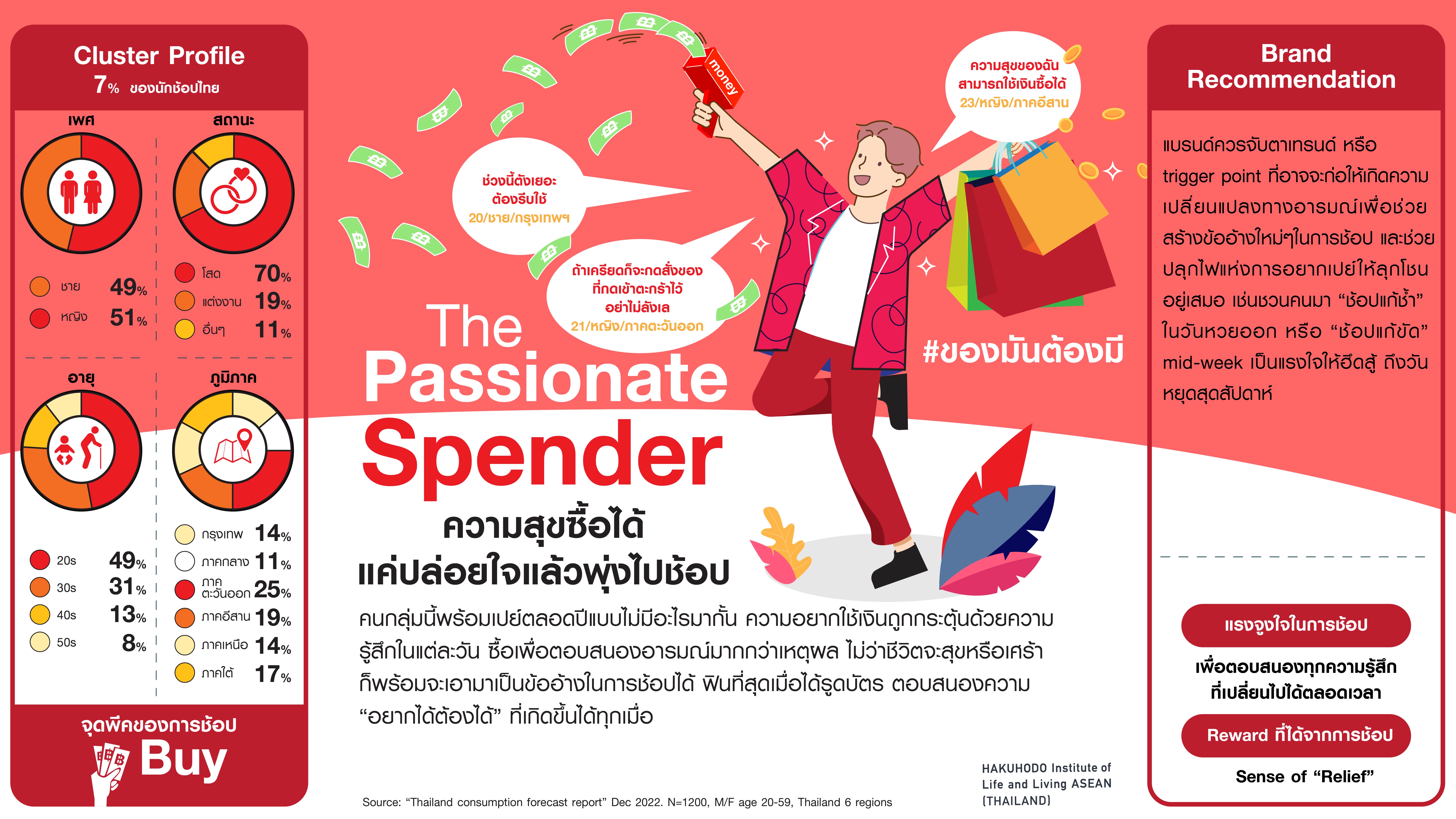 | บุคลิกเด่น | พร้อมรับความไม่แน่นอนอยู่เสมอ | ชอบซื้อ (ให้คนอื่น) โดยเฉพาะในครอบครัว | นักล่าโปรโมชั่น-ดีลสำคัญ เพื่อให้ได้ราคาที่คุ้มที่สุด | พร้อมเปย์ตลอดปี ไม่มีอะไรมากั้น | มองโลกแง่บวก ใช้จ่ายแบบสบาย ๆ | ลงทุนเพื่อภาพลักษณ์