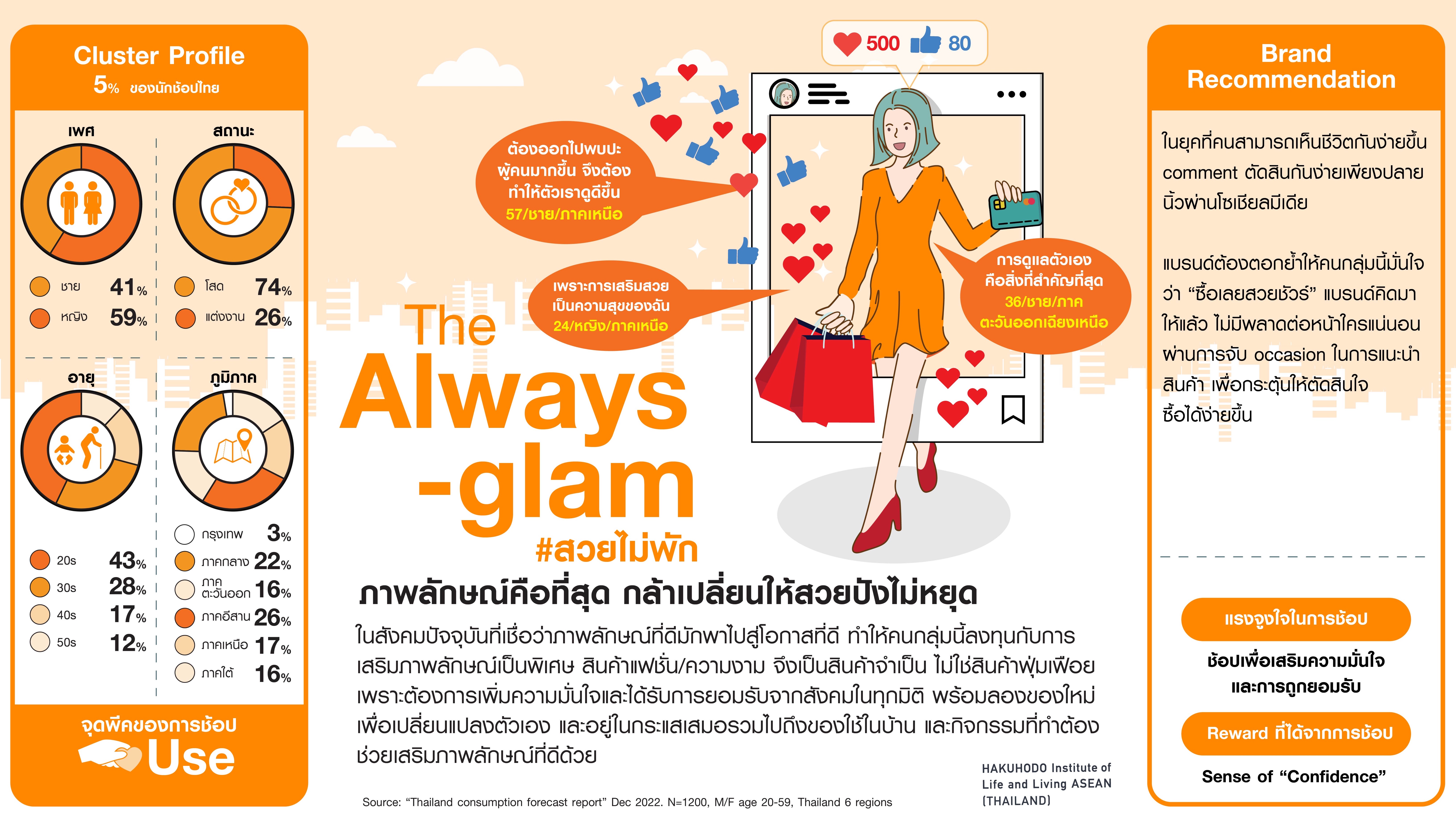 6. สวยไม่พัก (Always-Glam) 5% ของผู้ตอบแบบสอบถาม พบว่า เสื้อผ้า และผลิตภัณฑ์เพื่อความงาม มักติด Top 5 สินค้าที่ต้องการซื้อ และมีความต้องการซื้อสูงกว่า 30% ตลอดทั้งปี