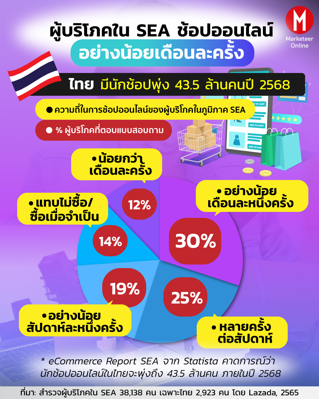 อีคอมเมิร์ซใน SEA โตไม่หยุด พบ 30% จาก 3.8 หมื่นคนที่สำรวจ ช้อปออนไลน์อย่างน้อยเดือนละครั้ง นับเฉพาะไทยนักช้อปพุ่ง 43.5 ล้านคน ภายในปี 2568