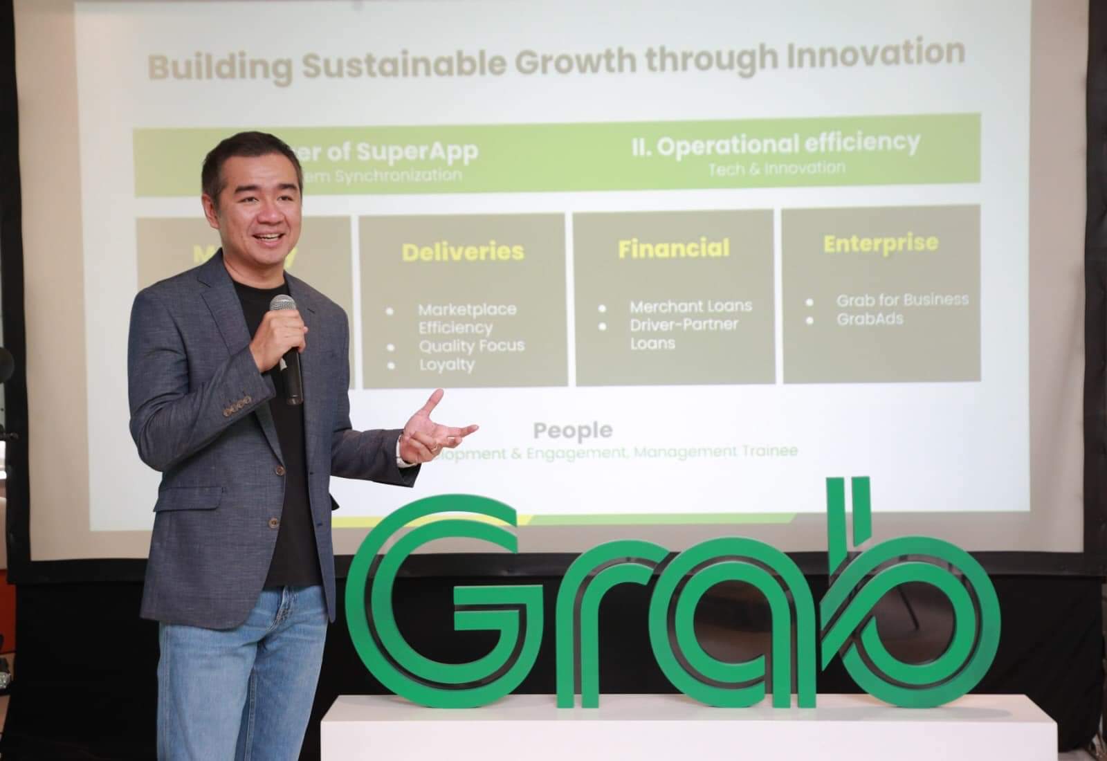 จากช่วงเวลาที่ให้บริการในไทยมาครบ 10 ปี จะยังเดินหน้ากลยุทธ์สำคัญ คือ “Power of Superapp” ร่วมมือและทำงานทุกธุรกิจใน Ecosystem ของแกร็บ ให้เกิด Synergy เอื้อประโยชน์ต่อกัน และ “Operational Efficiency” ดึงนวัตกรรมและเทคโนโลยีเข้ามาช่วยเพิ่มประสิทธิภาพในกระบวนการทำงาน เพื่อขับเคลื่อนทุกกลุ่มธุรกิจหลัก