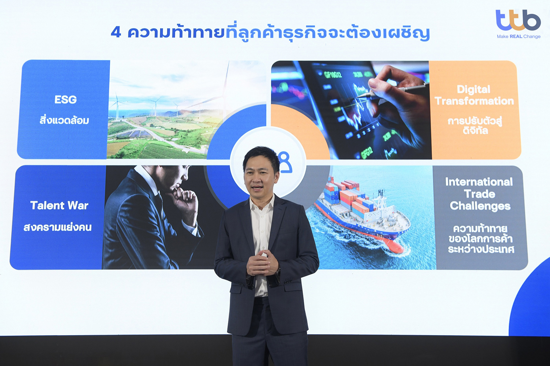 โดย ทีทีบี ตระหนักว่าผู้ประกอบการธุรกิจ ไม่ว่าขนาดใหญ่หรือเล็ก กำลังเผชิญอยู่ในโลกธุรกิจ ผ่าน 4 ความท้าทาย ทั้งด้านการทำธุรกิจด้วยวิถี ESG, การปรับตัวสู่ดิจิทัล เพื่อรับมือกับโลกยุคดิจิทัล ดิสรัปชัน, สงครามแย่งคนทำงานที่มีศักยภาพ และความท้าทายของโลกการค้าระหว่างประเทศที่ผันผวน