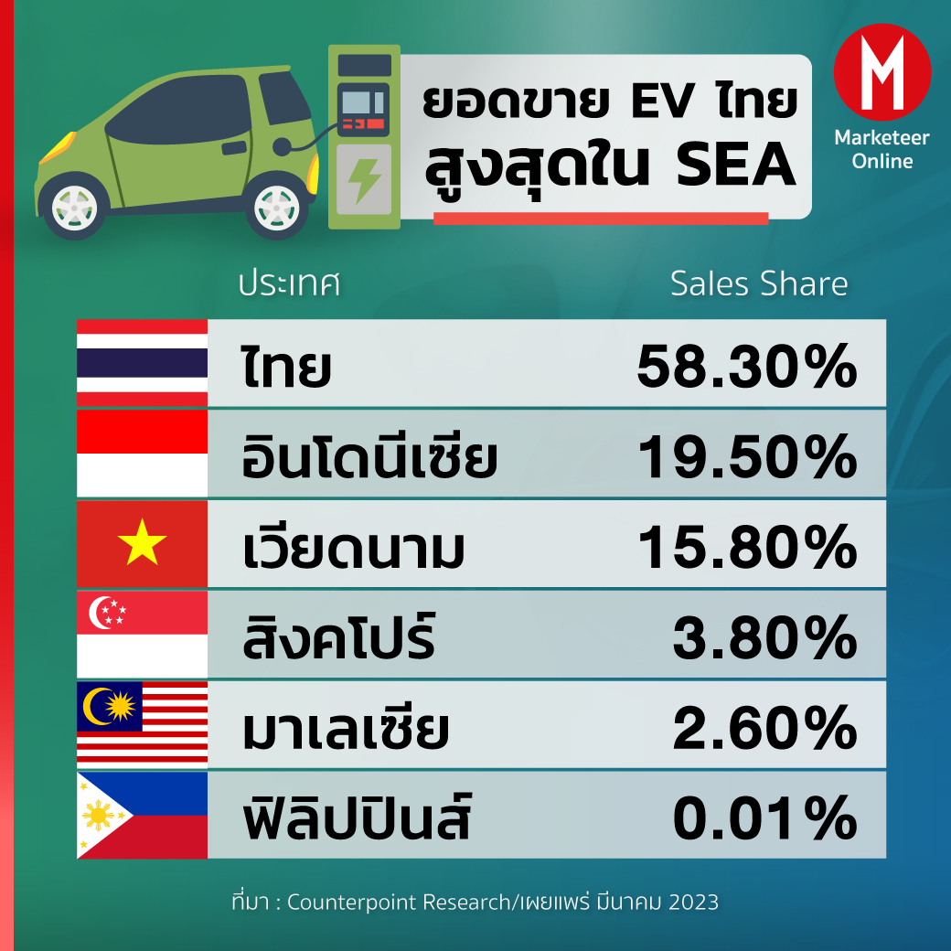 ไทย นับเป็นประเทศที่มียอดขายมากที่สุด ใน SEA ปัจจัยสำคัญมาจากแรงสนับสนุนของภาครัฐ ทั้งเงินอุดหนุนให้กับผู้บริโภค และสิทธิประโยชน์ทางภาษีแก่ภาคอุตสาหกรรมยานยนต์จากต่างประเทศที่จะเข้ามาลงทุน