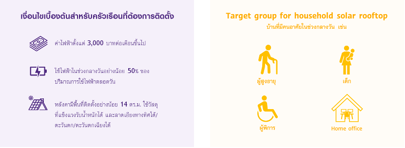 - ใช้ไฟฟ้าในช่วงกลางวันอย่างน้อย 50% ของปริมาณการใช้ไฟฟ้าตลอดวัน เช่น ครัวเรือนที่มีผู้สูงอายุหรือมีผู้ที่ต้องมีคนดูแล/พิการที่ไม่ได้ไปทำงาน และ Home office เป็นต้น