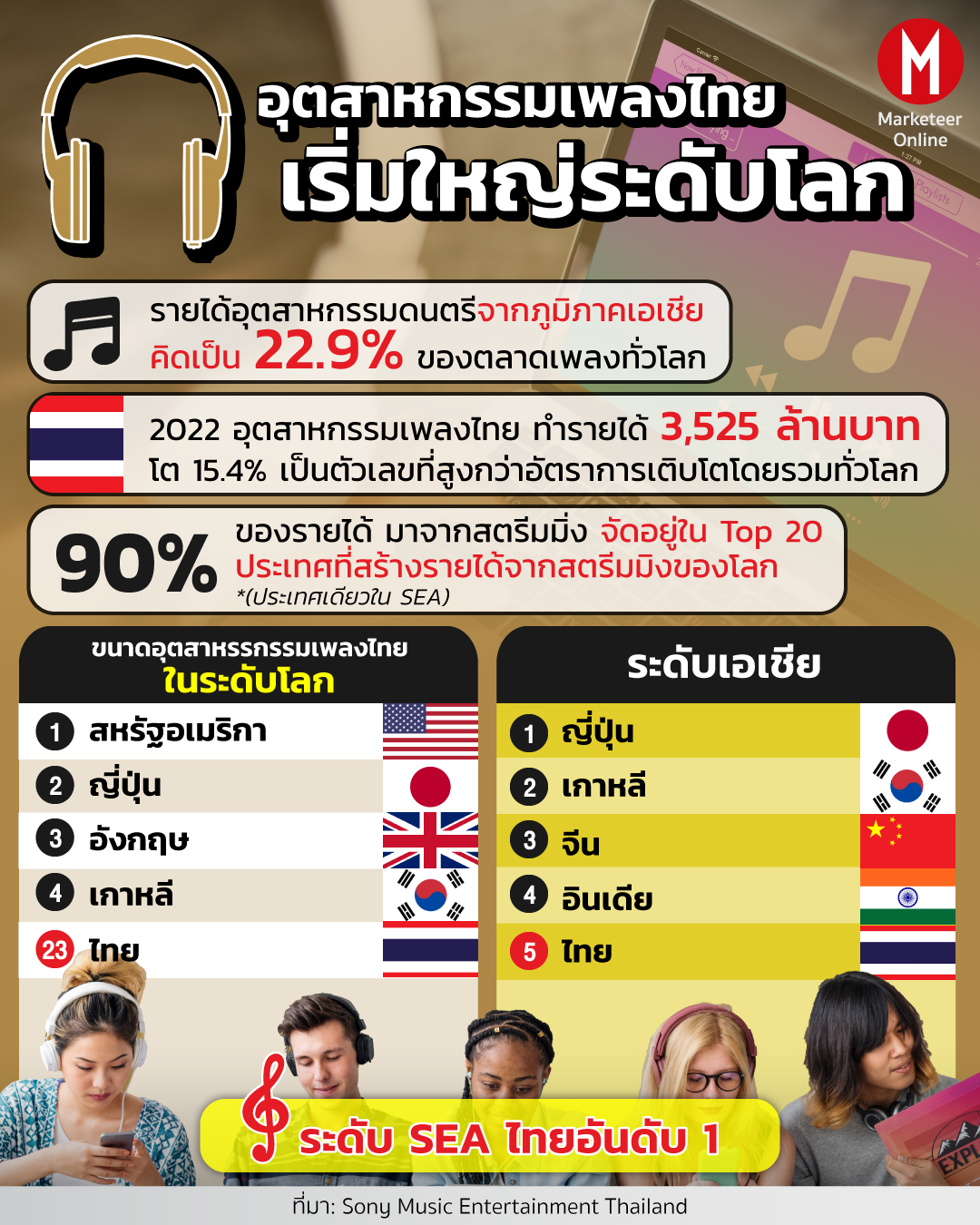 โดยเฉพาะอุตสาหกรรมเพลงไทย ที่ทำรายได้แตะ 100 ล้านดอลลาร์ (3,525 ล้านบาท) ได้เป็นครั้งเเรกในปี 2022 เเละกว่า 90% ของรายได้มาจากสตรีมมิ่ง ติด Top 20 ของโลก (ประเทศเดียวในเอเชียตะวันออกเฉียงใต้) นอกจากนั้น ด้าน physical (ซีดี, แผ่นเสียง, เทป) ยังเติบโตอย่างมีนัยสำคัญ