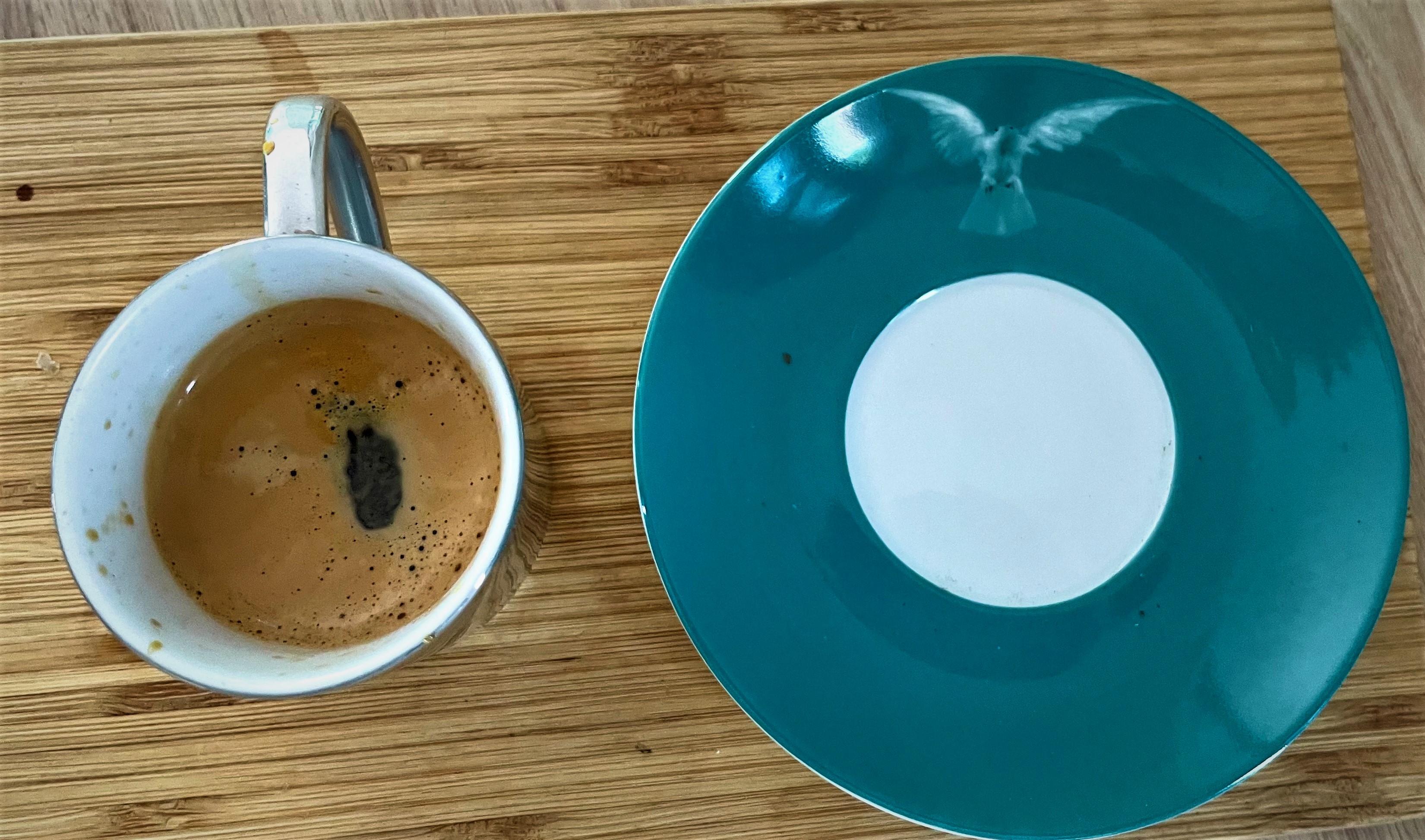 บรรยากาศจะดูเร้าใจมากขึ้น เมื่อเข้าคู่กับถ้วยกาแฟที่เพิ่งนำออกจากตู้โชว์ เป็นผลงานของชาวอังกฤษเช่นกัน ในชุด “The Incomplete Truth” โดย Damien Hirst (ภาพ 5-9) ว่ากันว่าเขาเป็นศิลปินผู้ประสบความสำเร็จมากที่สุดในวงการศิลปะอังกฤษยุค 90 และเป็นผู้อื้อฉาวด้วยเช่นกัน ด้วยมีนำการเสนอศิลปะเกี่ยวกับความตายหลายครั้ง ชิ้นนี้เป็นผลงานดูเรียบง่าย และแตกต่างออกไป มีขึ้นเมื่อทศวรรษที่แล้ว (ปี 2552) อยู่ในยุคเดียวกันกับ Rok Espresso มีวางจำหน่ายเป็นของที่ระลึกใน Tate Modern หอศิลปะร่วมสมัยใน London เป็นงาน Porcelain พอจะเรียกว่าเป็นชุดถ้วยกาแฟเอสเปรสโซ่ ขนาดที่พอเหมาะ มีสองชิ้นตามแบบแผน จานรองขอบนอกสีเขียว มีลายบาง ๆ เป็นภาพนกเหยี่ยว ตรงกลางสีขาว กับถ้วยดูธรรมดาฉาบสี Metallic ครั้นวางเข้าที่เข้าทางให้ภาพที่น่าทึ่ง และดูแสงสีตกกระทบแตกต่างกันไปอีก จากที่วางไว้ด้วยกัน และแยกออกจากกัน เมื่อค่อย ๆ ยกขึ้นจิบแต่ละครั้ง
