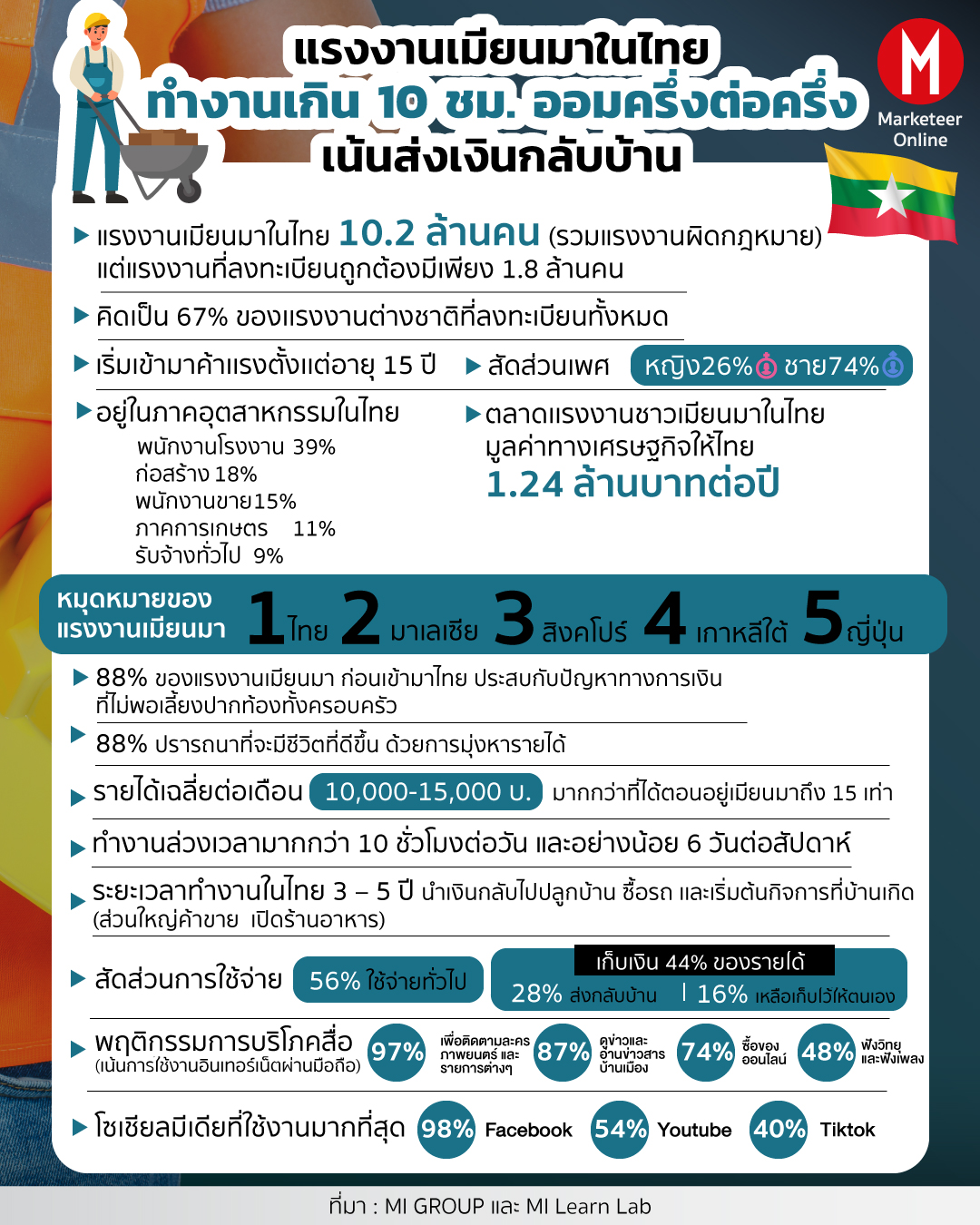 Media Intelligence Group (MI GROUP) เผยผลการสำรวจจากการร่วมมือระหว่าง MI BRIDGE กับ MI Learn Lab นำเสนอวิจัยเจาะลึกข้อมูลกลุ่มแรงงานชาวเมียนมา ตั้งเเต่อายุสิบห้าปีขึ้นไป ในเขตกรุงเทพฯ เเละจังหวัดโดยรอบ ผ่านช่องทางออนไลน์ ซึ่งจะเป็นโอกาสทองของธุรกิจไทย ในการเรียนรู้ จุดมุ่งหมาย พฤติกรรมการใช้ชีวิต สิ่งอุปโภคบริโภค เป็นประโยชน์ต่อการวางเเผนกลยุทธ์ จับทิศทางตลาด