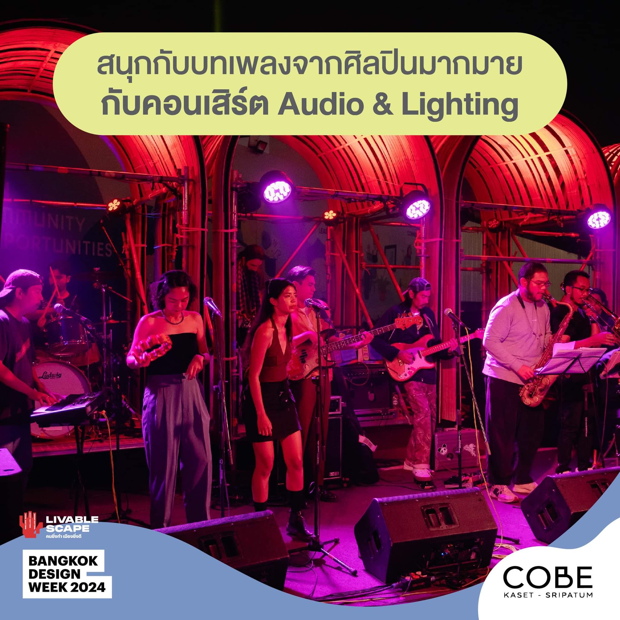 Bangkok Design Week 2024 กลับมาภายใต้ธีม ‘Livable Scape คนยิ่งทำ เมืองยิ่งดี’ ธนพัฒน์ บุญสนาน สถาปนิกผู้เชี่ยวชาญด้านงานไม้ไผ่ เจ้าของ ธ.ไก่ชน หนึ่งในหัวเรือหลักของงาน เล่าถึงคอนเซปต์การออกแบบว่า บางครั้งบางพื้นที่ก็มีเรื่องราวจำกัด ไม่ใช่ทุกย่านในเมืองกรุงจะมีเรื่องเล่าที่โดดเด่น การจะเผยเส่นห์บางอย่างออกมา ต้องอาศัย Story telling สร้างเรื่องราว แลนด์มาร์ค ดึงดูดด้วยความสร้างสรรค์แทน ย่านเกษตรฯ – บางบัว ก็เป็นเช่นนั้น แน่นอนว่าเสน่ห์ของพื้นที่มีอยู่ แต่การเล่าเรื่องหรือรังสรรค์ความงดงามขึ้นมาเพิ่ม จะกลายเป็นแม็กเนตที่เชื่อมโยงระหว่างเมืองกับผู้คนได้อย่างน่าสนใจ