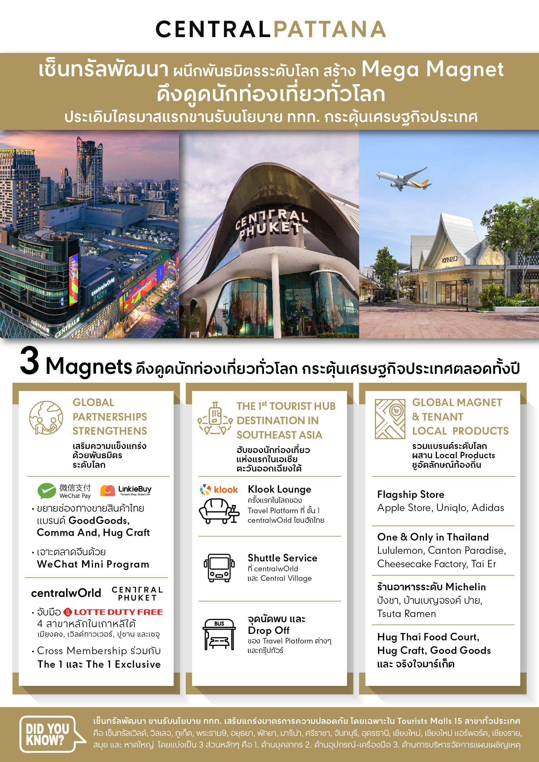 ดร.ณัฐกิตติ์ ตั้งพูลสินธนา รองกรรมการผู้จัดการใหญ่ สายงานการตลาด บริษัท เซ็นทรัลพัฒนา จำกัด (มหาชน) กล่าวว่า “ตัวเลขนักท่องเที่ยวจากสำนักงานตรวจคนเข้าเมือง พบว่าตั้งแต่วันที่ 1-31 มกราคม 2567 ที่ผ่านมา มีนักท่องเที่ยวต่างชาติเดินทางมาเที่ยวไทยเกิน 3 ล้านคนแล้ว สร้างรายได้มากกว่า 1 แสนล้านบาท โดยจำนวนนักท่องเที่ยวต่างชาติสูงสุด 5 อันดับแรก ได้แก่ จีน 5.1 แสนคน, มาเลเซีย 3.2 แสนคน, เกาหลีใต้ 2.2, รัสเซีย 2.2 แสนคน, แสนคน และอินเดีย 1.6 แสนคน อีกทั้งเซ็นทรัลพัฒนาเอง มีศักยภาพในการดึงดูดนักท่องเที่ยวอยู่แล้ว จากการมีศูนย์การค้าในเครือมากถึง 40 สาขา โดยมีศูนย์การค้าให้บริการอยู่ในจังหวัดที่เป็นสถานที่ท่องเที่ยวยอดนิยมในประเทศไทยถึง 15 สาขา ครอบคลุมทุกภูมิภาคของประเทศไทย ”