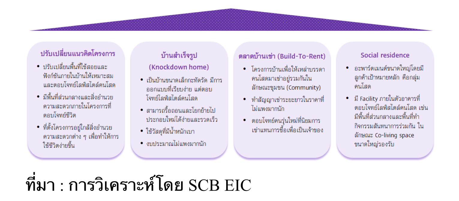 อสังหาริมทรัพย์ เป็นอีกหนึ่งธุรกิจที่มีการปรับตัวเพื่อคว้าโอกาสจากกระแสคนโสด โดยพบว่าปัจจุบันผู้ประกอบการในกลุ่มอสังหาริมทรัพย์มีการออกแบบแนวคิดโครงการเพื่อตอบโจทย์กระแสบ้านคนโสดมากขึ้นเรื่อย ๆ โดยพบว่าปัจจุบันได้มีการริเริ่มโครงการที่อยู่อาศัยเพื่อตอบโจทย์กลุ่มคนโสดโดยเฉพาะ (รูปที่ 8) ตัวอย่างเช่น ในประเทศเนเธอร์แลนด์ มีการสร้างบ้านตัวอย่างสำหรับคนโสด โดยเป็นลักษณะบ้านสำเร็จรูป (Knockdown home) ซึ่งมีดีไซน์ที่เรียบง่ายแต่มีฟังก์ชันการใช้งานครบถ้วน ใช้วัสดุที่มีน้ำหนักเบา และที่สำคัญคือสามารถโยกย้ายไปยังสถานที่ต่าง ๆ ได้อย่างสะดวกรวดเร็วเนื่องจากใช้เวลารื้อและสร้างใหม่เพียงแค่วันเดียว โดยกลุ่มลูกค้าเป้าหมายหลักของโครงการนี้ คือหนุ่มสาวโสดที่มีอายุระหว่าง 25-35 ปี รวมทั้งกลุ่มที่เพิ่งเริ่มต้นชีวิตทำงาน เพื่อตอบโจทย์คนที่รักอิสระ อยากมีพื้นที่ส่วนตัวที่อยู่คนเดียวได้แบบสะดวกสบายและสบายใจ สำหรับในไทยเองก็พบว่ามีผู้ประกอบการในกลุ่มอสังหาริมทรัพย์ที่นำเสนอบ้านทางเลือกในลักษณะนี้ออกมาเจาะตลาดกลุ่มคนโสดมากขึ้นเช่นเดียวกัน เพราะนอกจากจะประหยัดเวลาในการก่อสร้างแล้ว ยังช่วยประหยัดงบประมาณได้อีกด้วย นอกจากนี้ ผู้ประกอบการในไทยบางรายยังมีการทยอยเปิดตัวโครงการที่อยู่อาศัยแนวราบสำหรับเจาะกลุ่มคนโสด เพื่อรองรับความต้องการของผู้บริโภคกลุ่มนี้ที่มีแนวโน้มเพิ่มมากขึ้นอย่างต่อเนื่องในอนาคตอีกด้วย