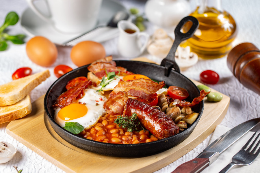 ผู้คนในสหราชอาณาจักรมักรับประทานอาหารเช้าที่เรียกว่า Full English ประกอบด้วยเบคอน ไข่ลวกหรือไข่ดาว มะเขือเทศ เห็ด ขนมปังทอดหรือขนมปังปิ้ง ไส้กรอก และถั่ว