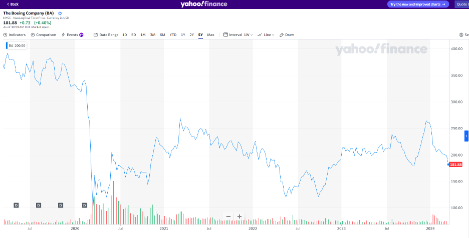 ราคาหุ้นของ Boeing ในช่วง 5 ปีที่ผ่านมา ที่แทบจะนอนก้นไม่ไปไหน: Yahoo Finance